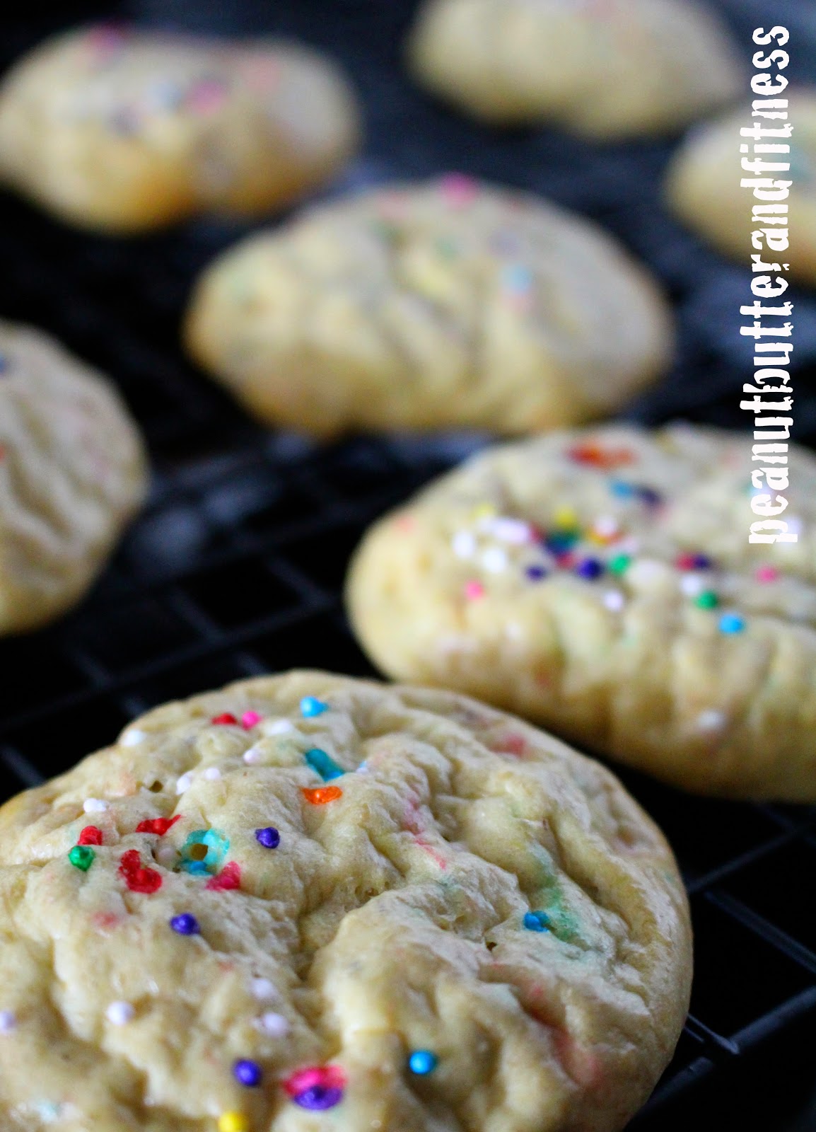 I really like the Peanut Butter Marshmallow flavor to drink and I’ve been making some fun food creations with the Cake Batter flavor…like these cookies! These are less than 50 calories each plus they have the same amount of protein as they have carbs and only 2 grams of sugar, so they’re a winner in my book. And they’re fun-fetti looking and cake batter flavored – amazing!