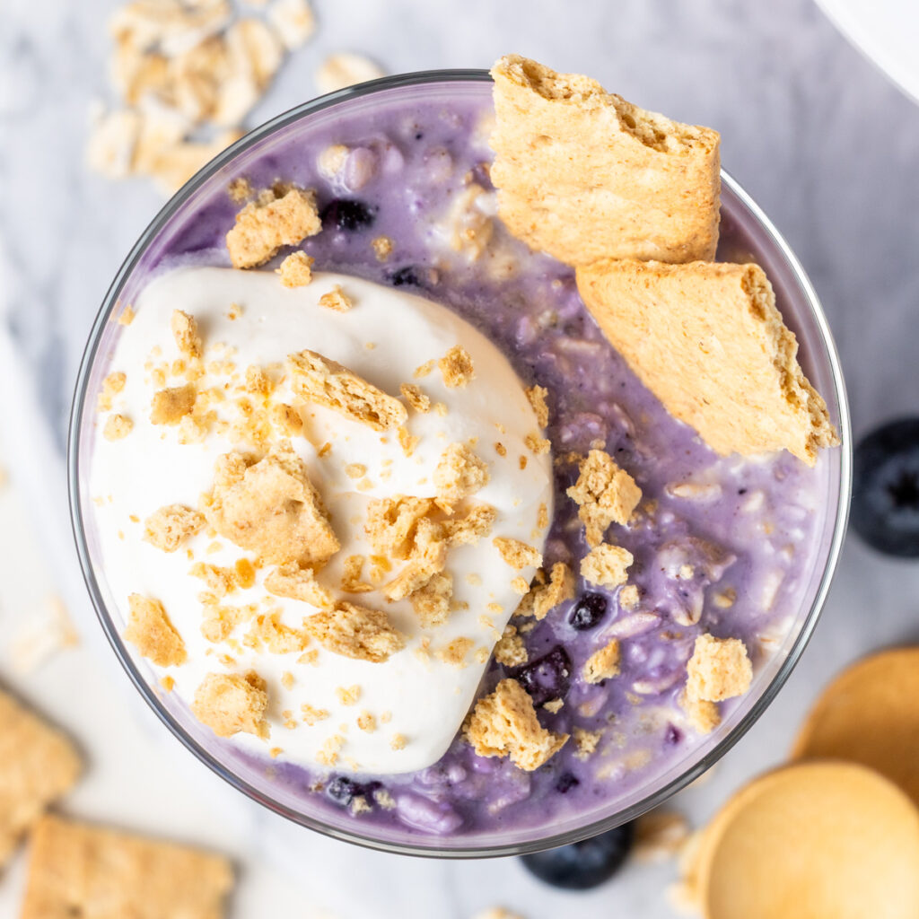I like to microwave them for 30 seconds to 1 minute to take the chill off, but that’s totally optional. A dollop of whipped cream, whipped cream cheese, or Greek yogurt along with crushed graham crackers on top will give them a decadent vibe that makes breakfast more inviting!