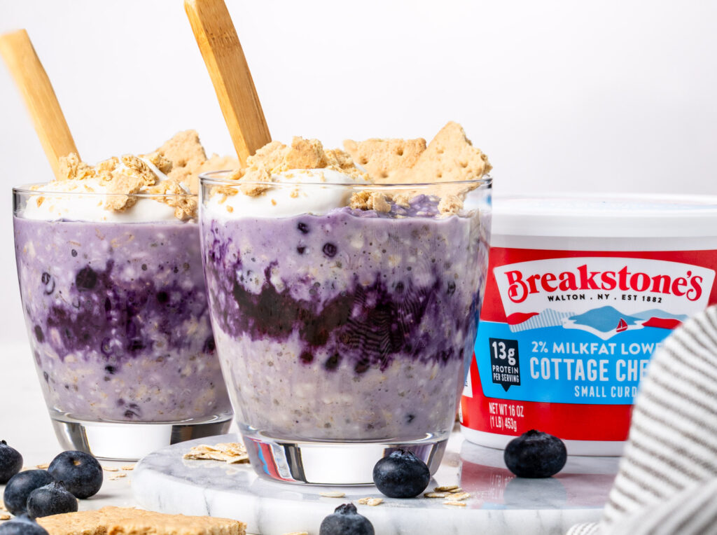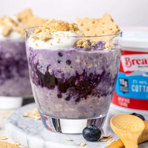 These quick and easy Blueberry Cottage Cheese Overnight Oats have 11 grams of protein, 5 grams of fiber, and give cheesecake vibes thanks to Breakstone’s cottage cheese! Adding cottage cheese to your overnight oats is a great way to boost protein content without adding protein powder, and it’ll help keep you fueled all morning.