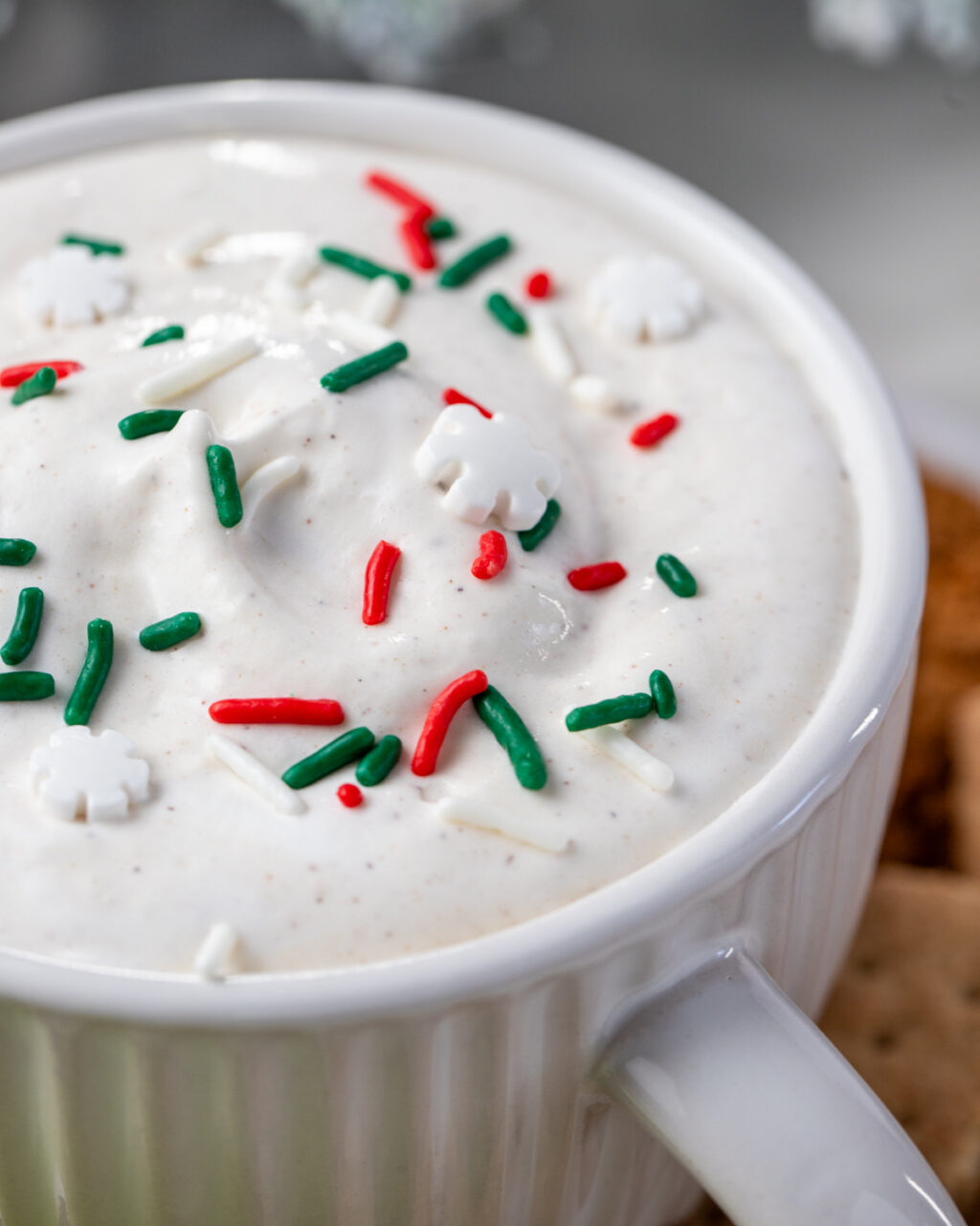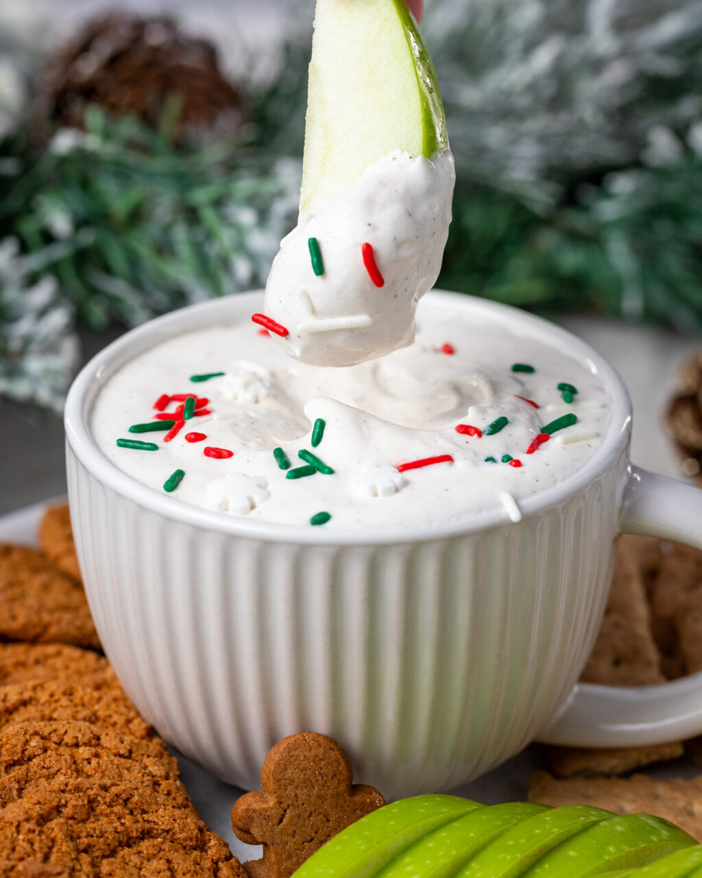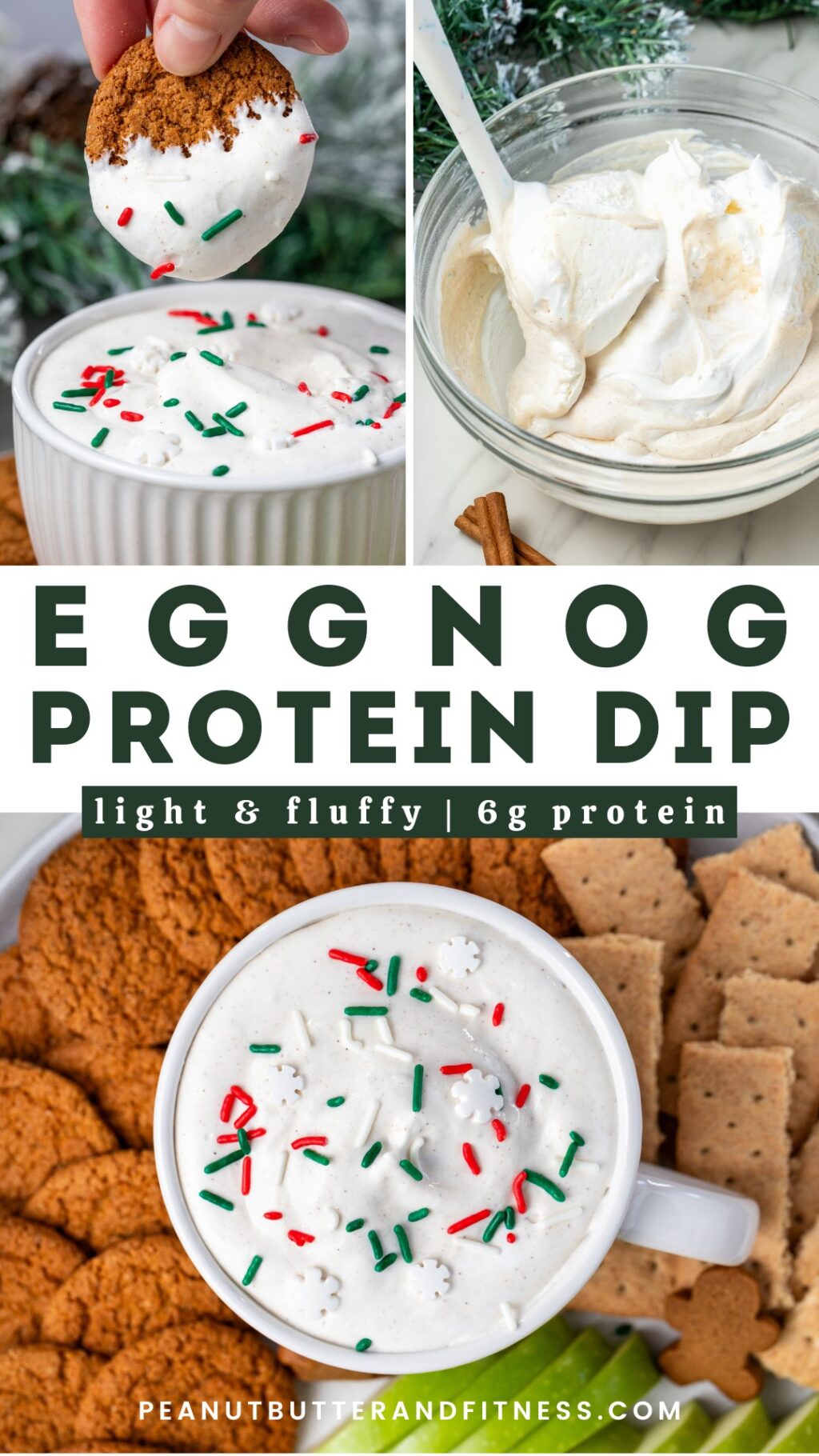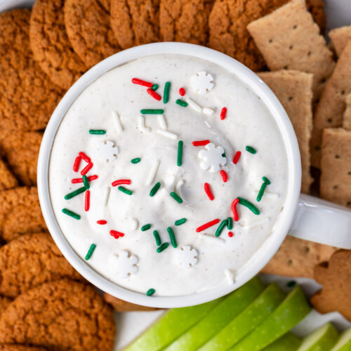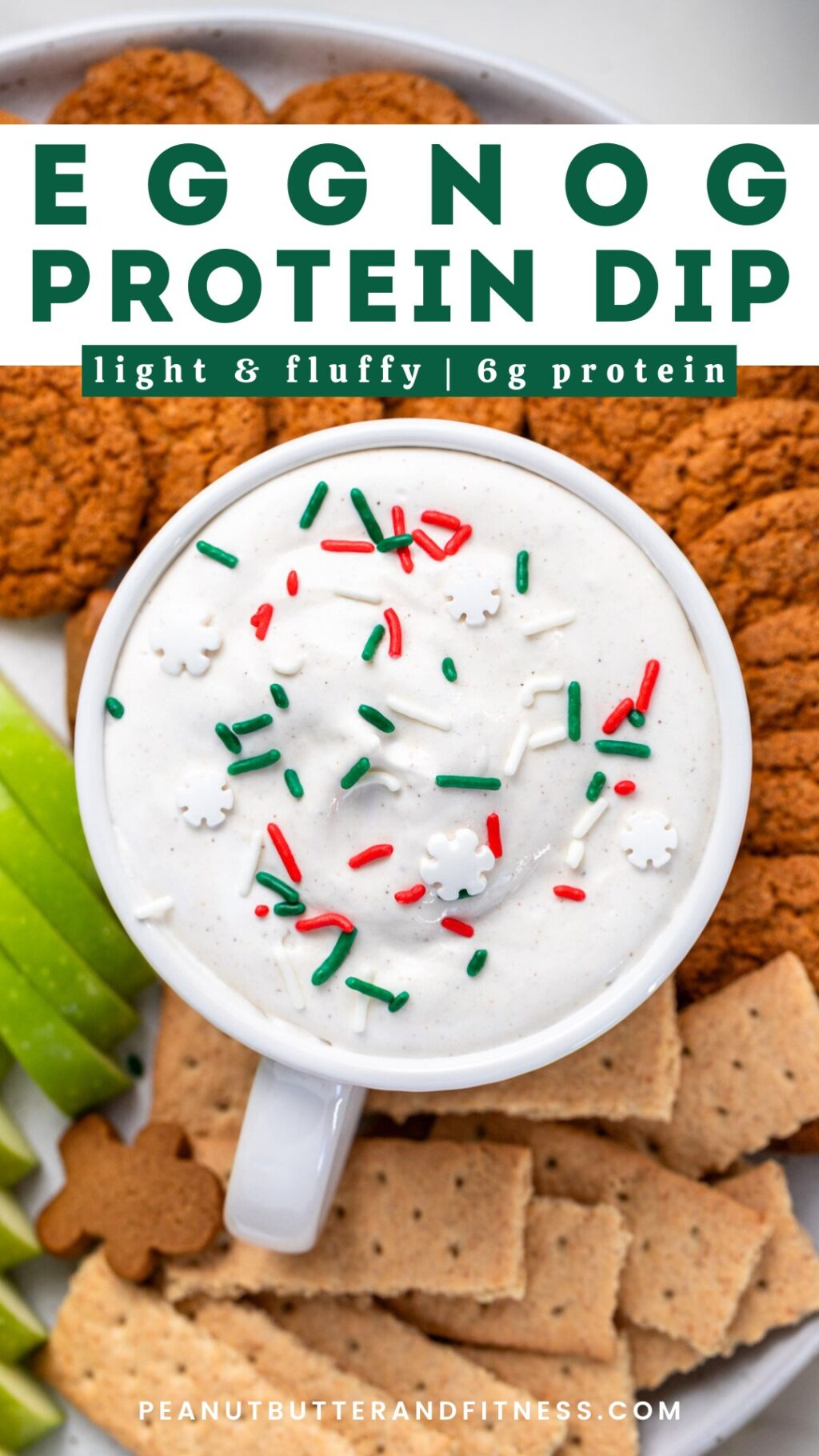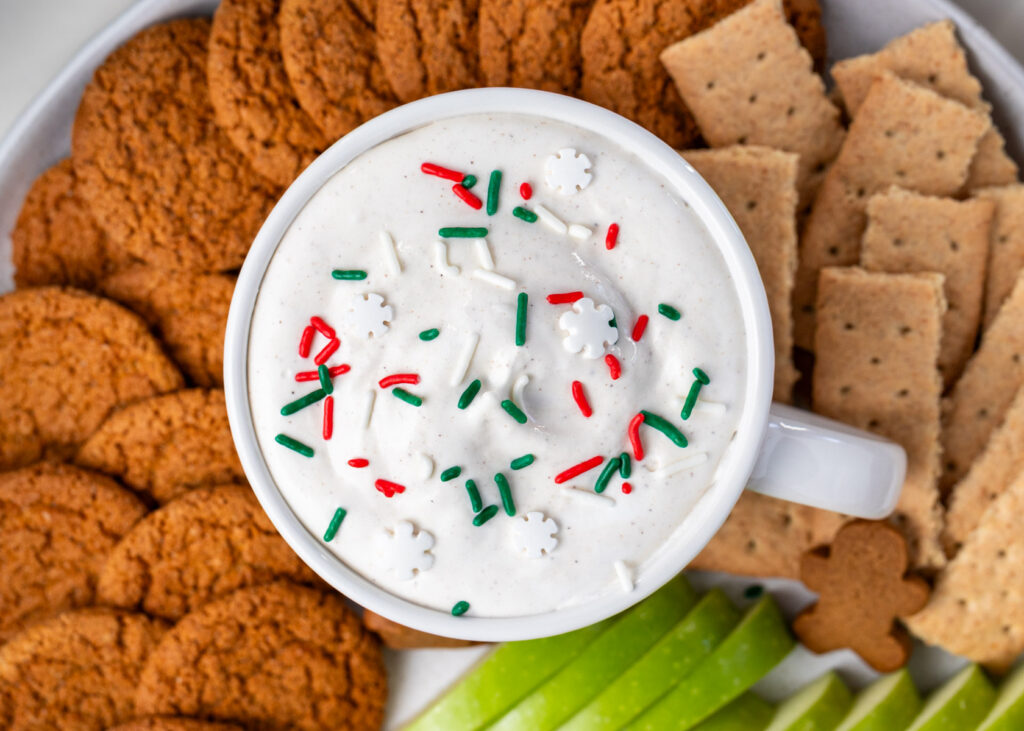 Today I’m continuing my countdown to Christmas with this easy-peasy Eggnog Protein Dip! This is such a quick and easy dip to add to the appetizer or sweets table. It’s a great option to have available for your health-conscious friends at the party, but everyone will enjoy this one. I like serving it with a variety of dipper options like green apples, gingersnap cookies, and cinnamon graham crackers. You could even offer a sweet/salty combo option with pretzel crisps!