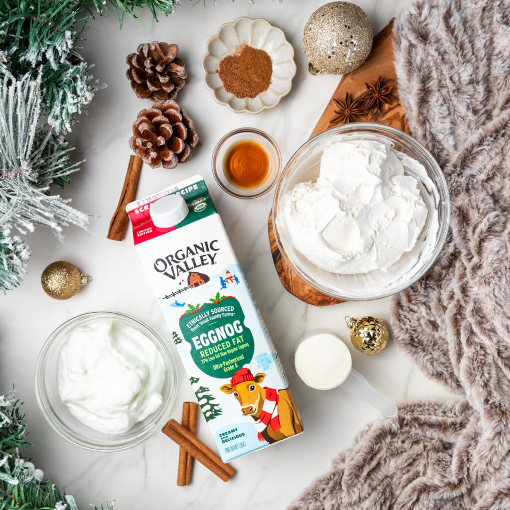 - Eggnog – I opted for the reduced fat store bought option made by Organic Valley. As far as eggnogs go, this one is a little on the thin side since it has less fat, but it still has great flavor. If you have a personal favorite or make your own at home, those will certainly work and may give you an even creamier dip.