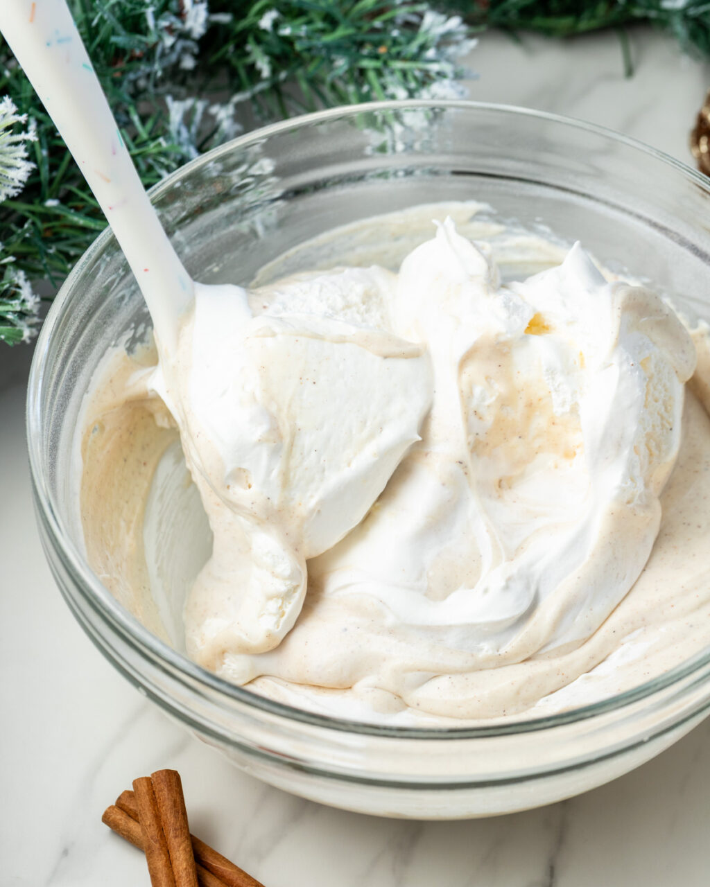 - Whisk eggnog, Greek yogurt, casein protein powder, spices, and vanilla until smooth. Fold in Cool Whip until incorporated. Serve chilled.
