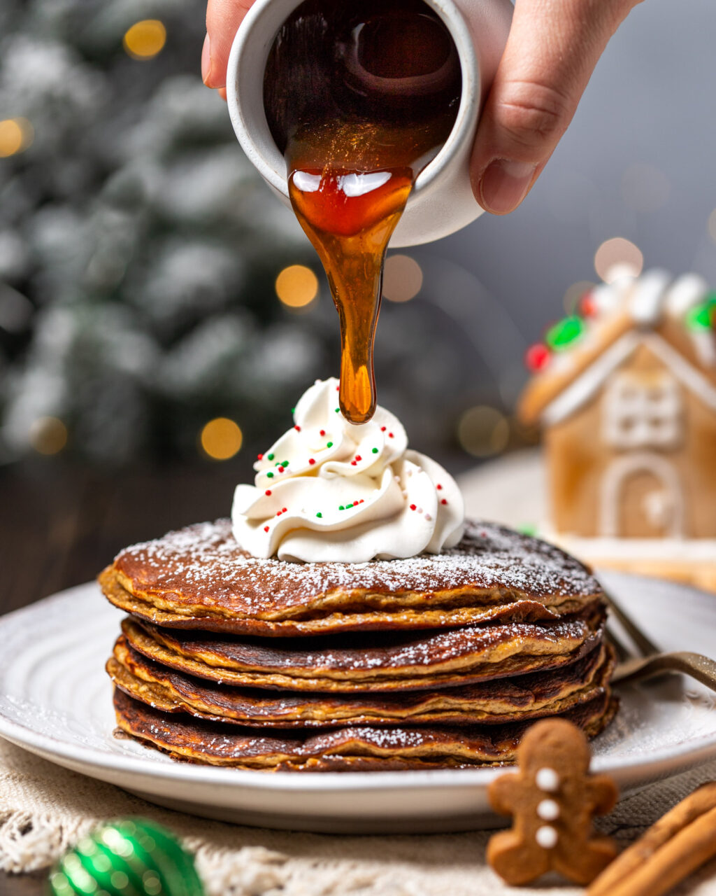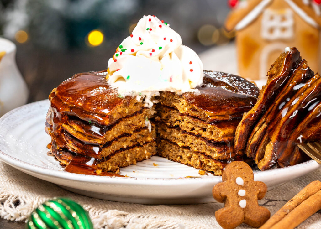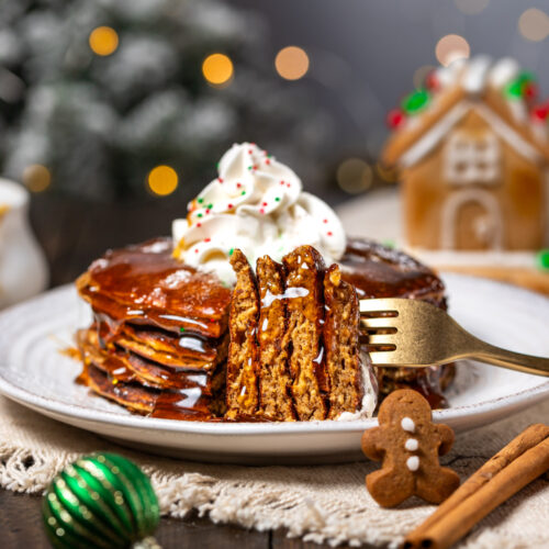 Christmas is less than a week away! Are you ready? I’ve got the star of your Christmas breakfast menu ready to go: Gingerbread Protein Pancakes! I’m really digging gingerbread this year and these fluffy protein pancakes are totally my jam. They have all the classic gingerbread flavors but in a better-for-you breakfast format. And who doesn’t love pancakes?!