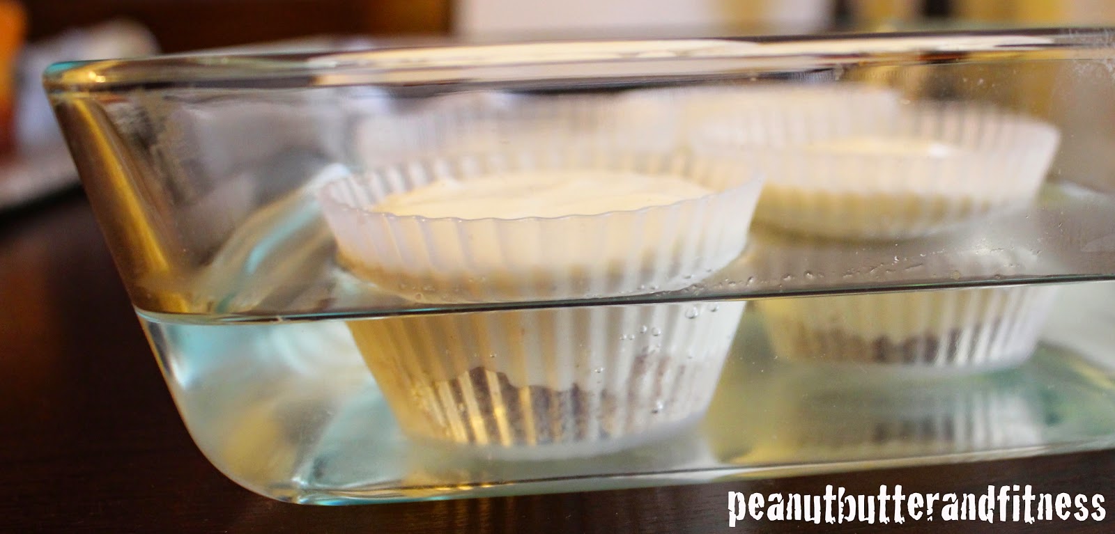 - Place cheesecake cups into larger baking dish and fill dish with water until almost even with the top of the cheesecake filling. Bake at 325 degrees for 20-23 minutes or until centers of cheesecake are still a little jiggly (like Jello).