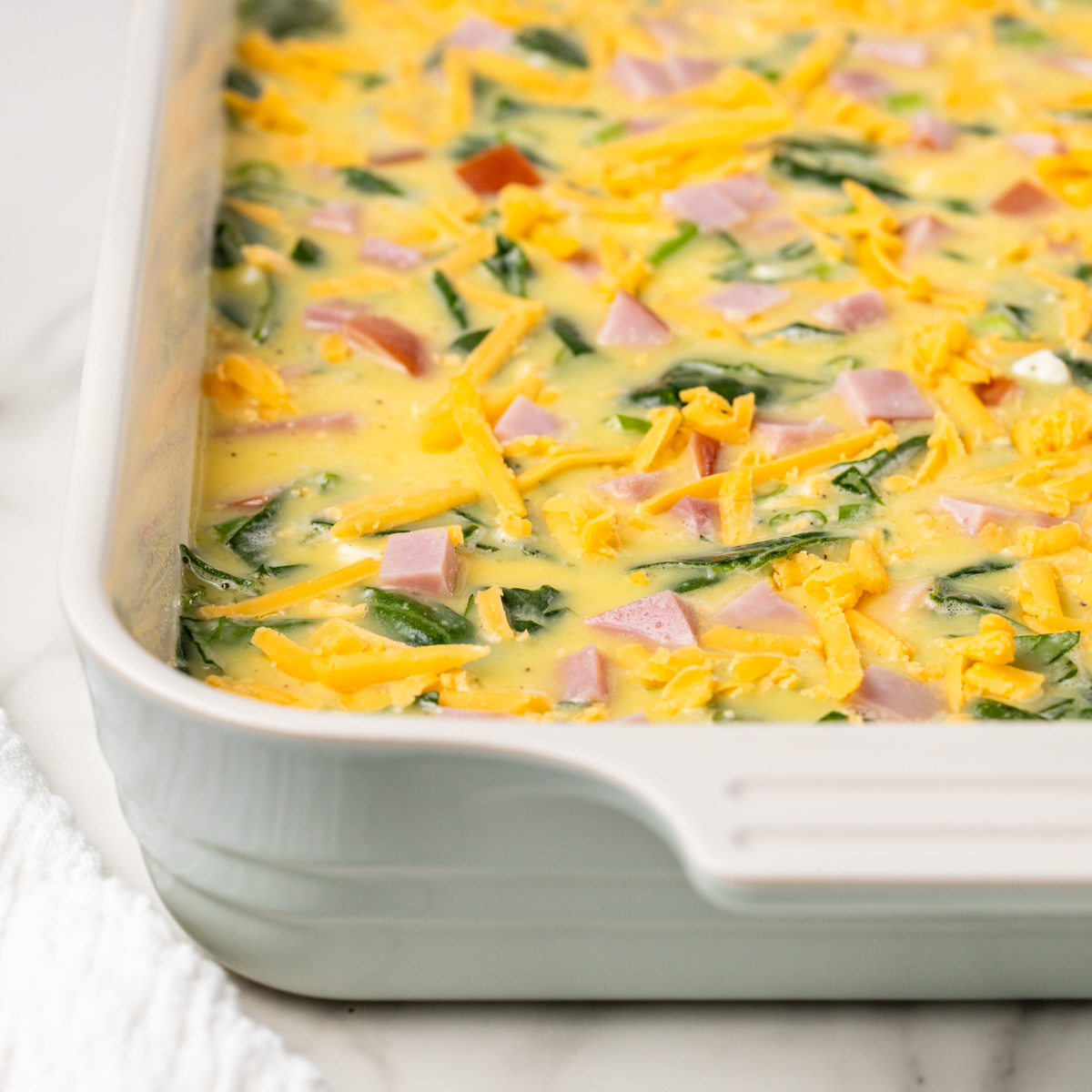 Instead of just dumping them, “sprinkle” the ham on top – that’ll help push some of the spinach down and keep some ham visible at the top of the casserole. Top it all off with some of the cheese so it can bake up gorgeous and golden brown where everyone can see it.