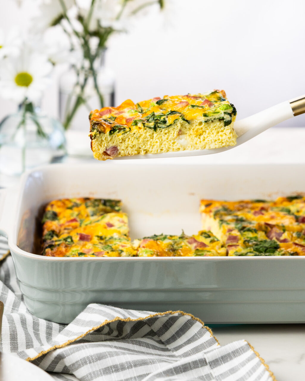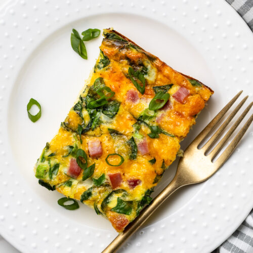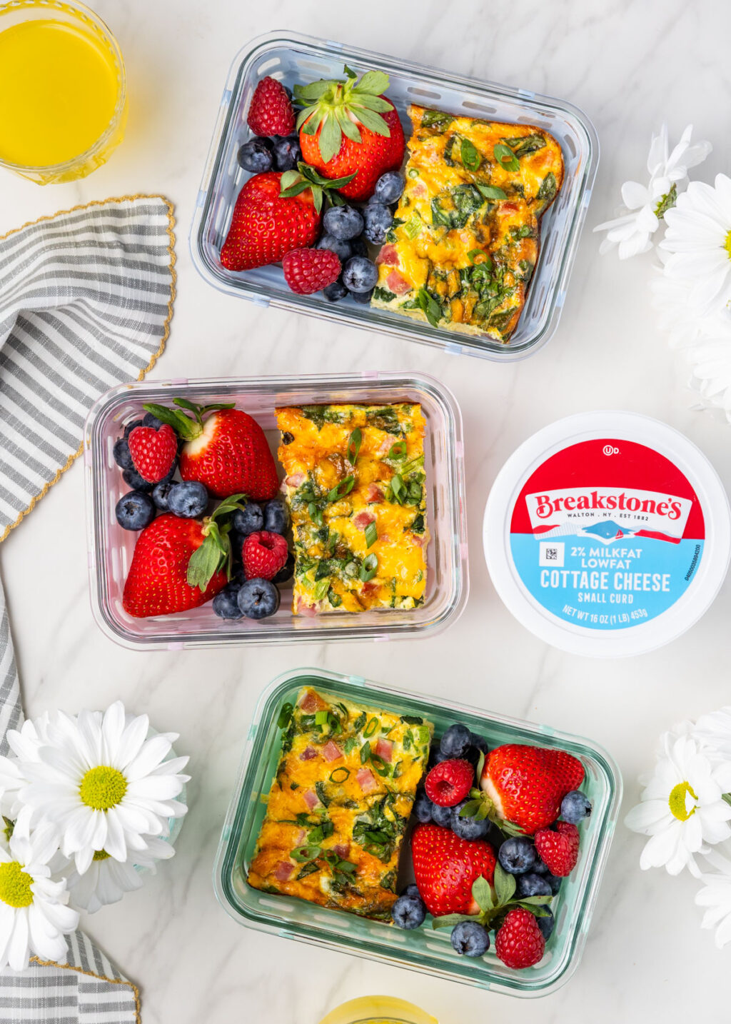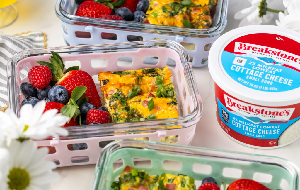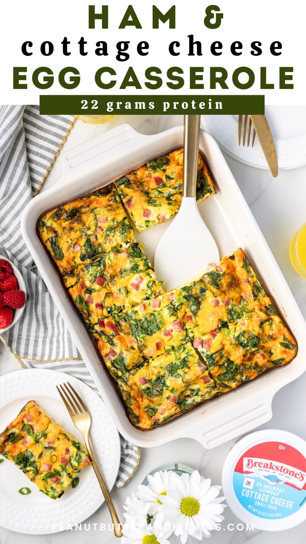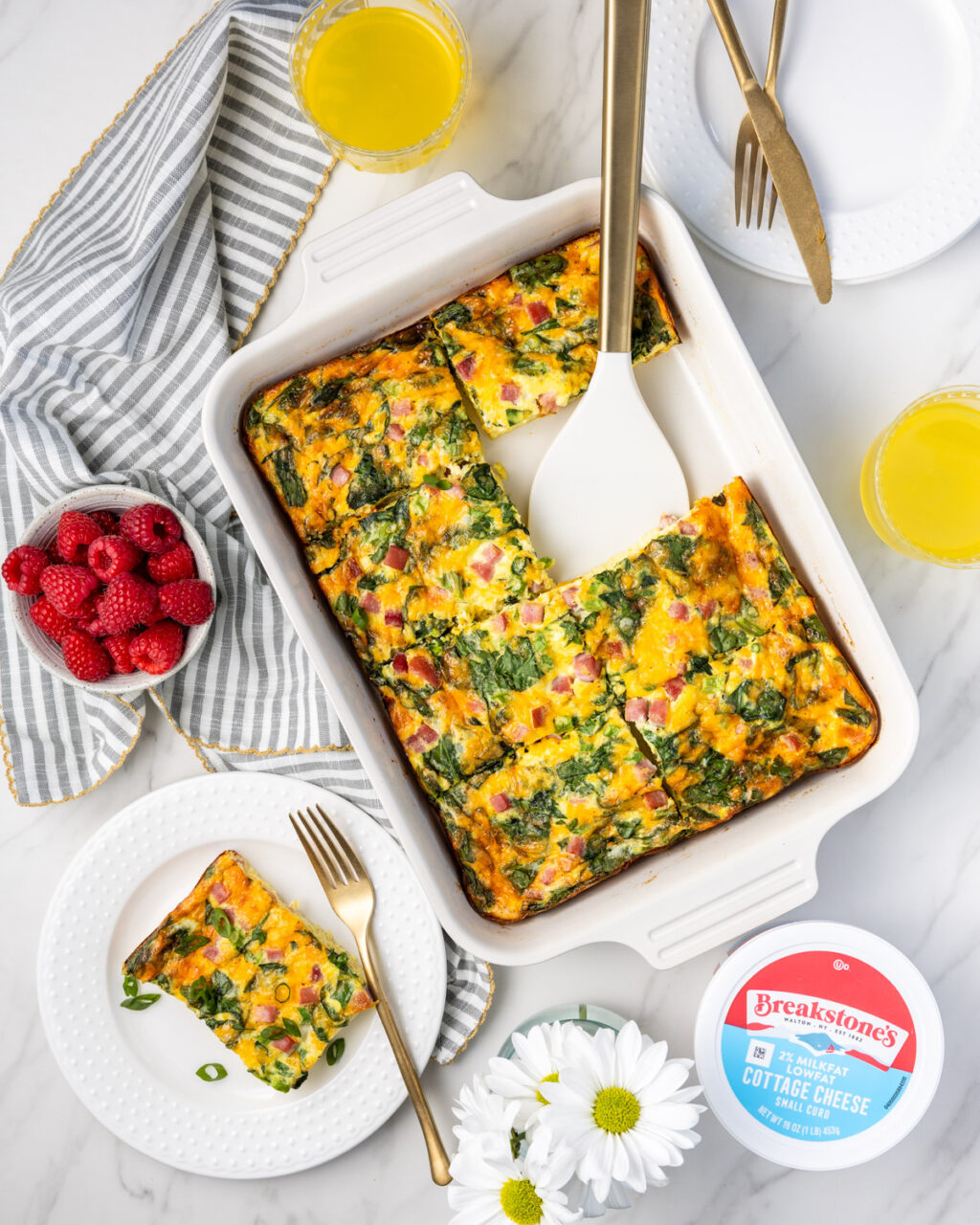 Spring is just starting to spring and that means we need all the brunch recipes like this Ham & Cottage Cheese Egg Casserole! I love this recipe because it tastes incredible and even a little decadent, but it’s packed with 22 grams of protein per slice. Breakstone’s Cottage Cheese sneaks in plenty of good-for-you protein, plus I used a mix of liquid egg whites and whole eggs to keep the fat content in check without sacrificing flavor.