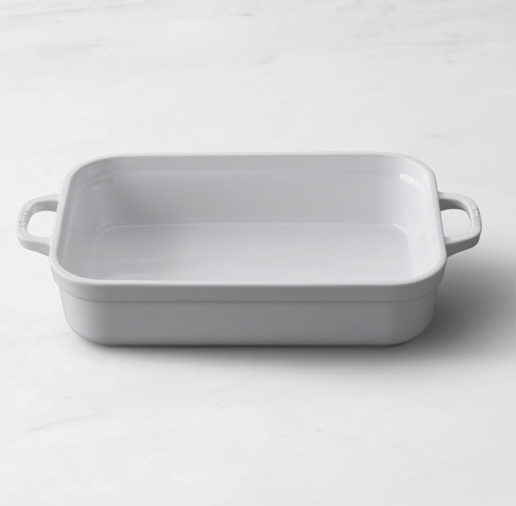 The exact Le Creuset casserole dish pictured here is an older version that I found at HomeGoods and is actually 12.5 x 10″, so I linked something similar that’s easy to find online.