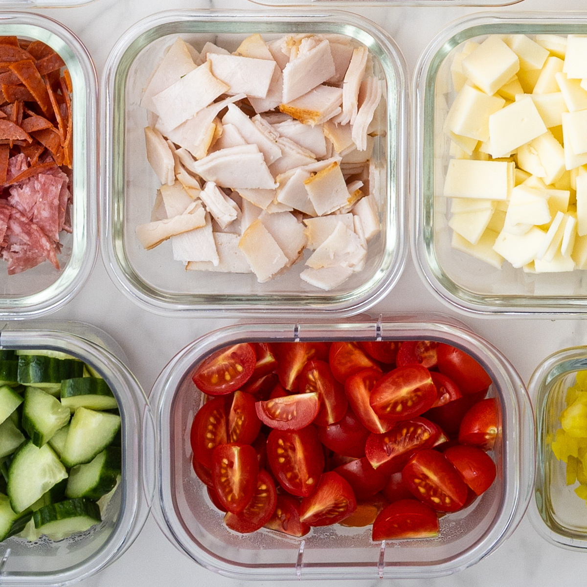 - Deli turkey – Most of the grinder salad recipes call for ham, but since I was meal prepping this, I wanted one of the meats to be less salty and higher in protein.