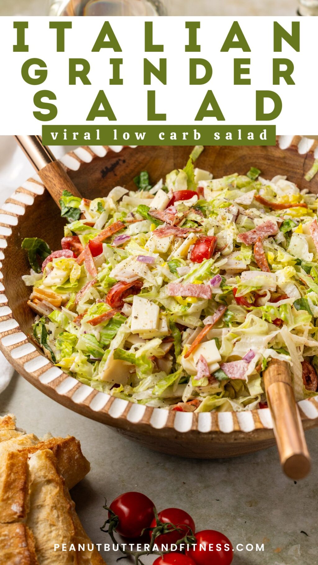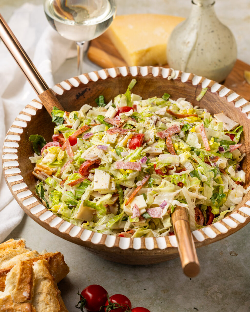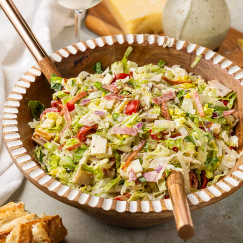 I am way behind on trying out the viral Italian Grinder Salad recipe from social media, but as I was racking my brain for a new salad to bring to the blog and my meal preps this year, I finally stumbled on this idea. Let me tell you, it’s sooo tasty and I can’t believe I’ve been missing out for so long! This is one of those salads where the way you chop everything up really matters – you want to be able to get as many of the toppings in one bite as you can. If things are chopped up too large, you can’t do that.
