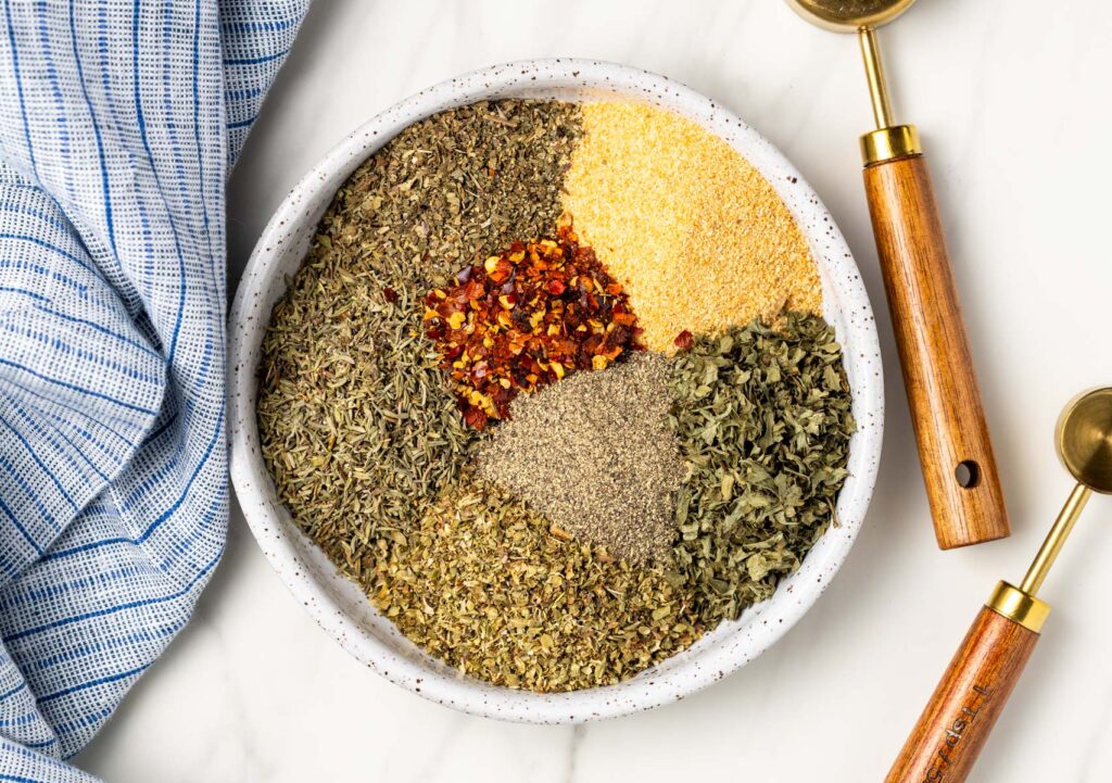 - Garlic powder – While not always included in Italian seasoning blends, I opted to go for it. Even if you use garlic with your heart, a little extra doesn’t hurt!