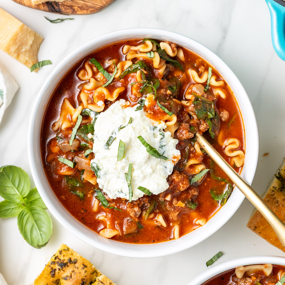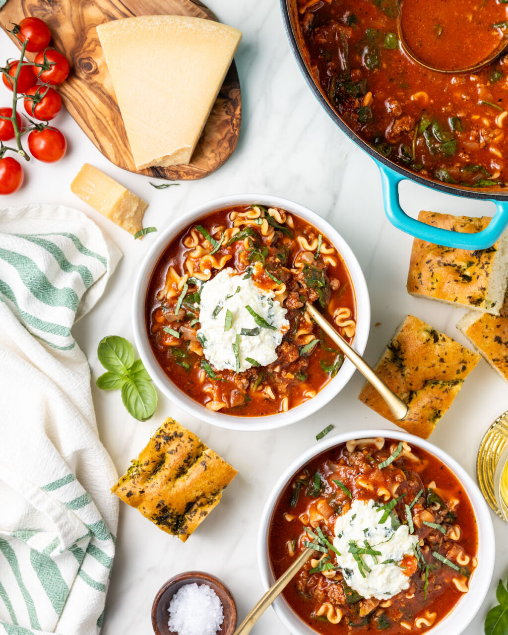 - Ricotta, mozzarella, and parmesan cheeses – Adding these on top to melt into the soup really give you the lasagna effect. You can mix them all together or add them separately.