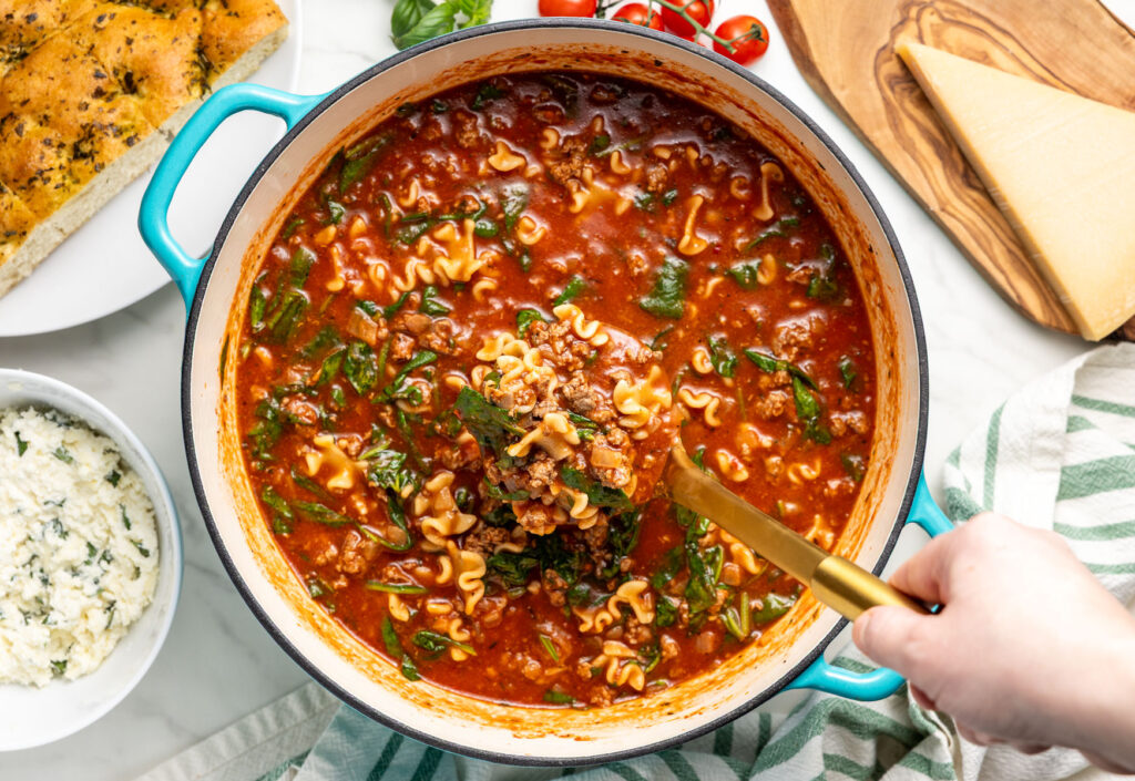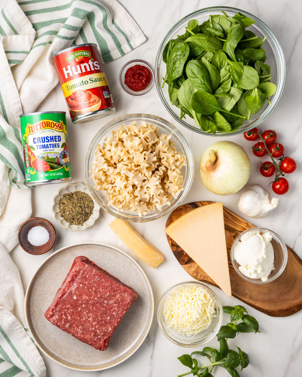 Here’s what you’ll need to recreate this Lasagna Soup. Note, a few ingredients are not included in the photo above because sometimes I forget to grab them off the counter (*insert face palm here*).