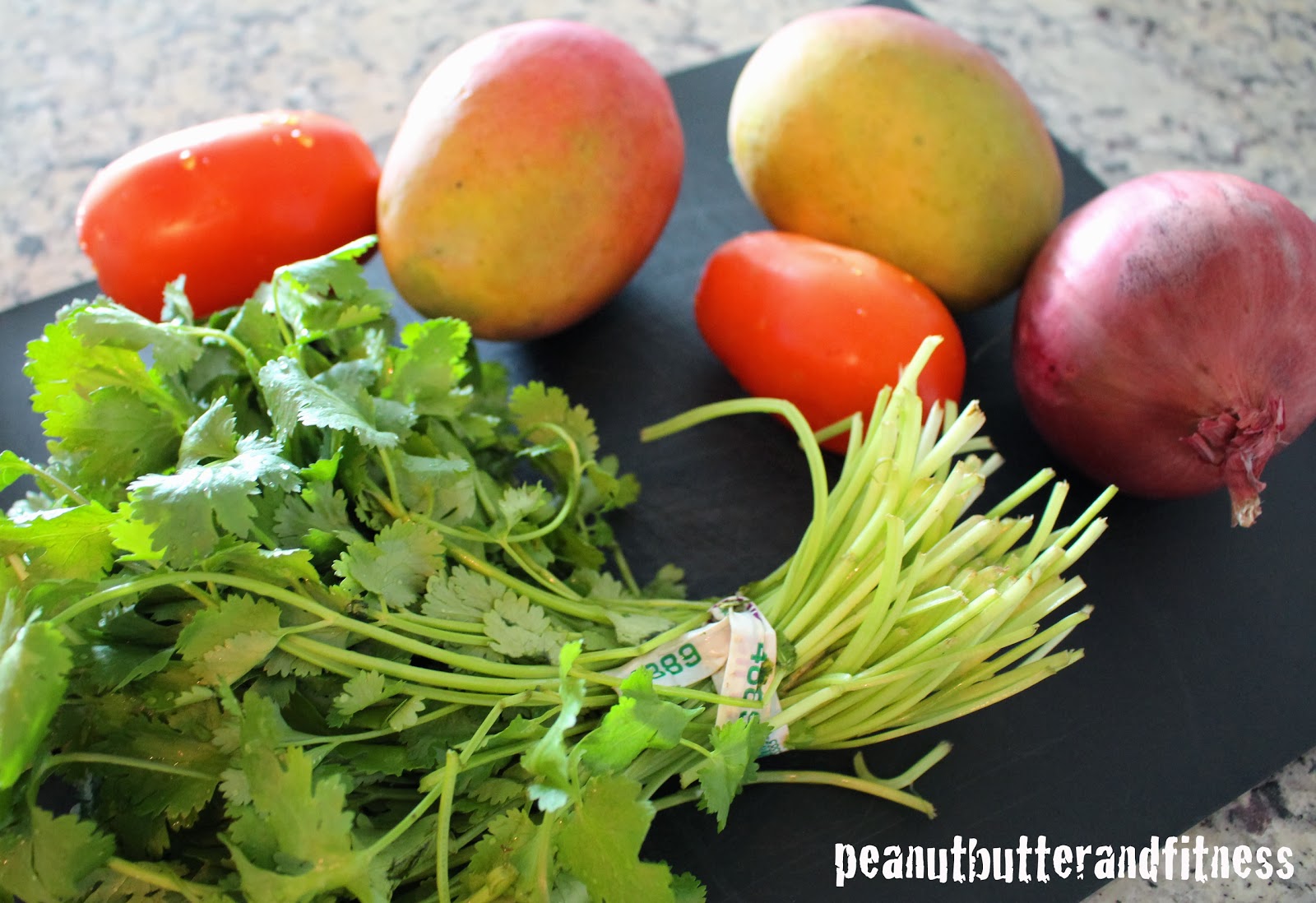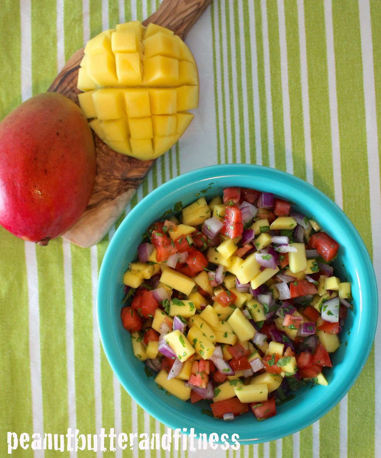 It’s sad to say, but mangoes are not in season right now 🙁 Although I managed to find a few when I went to the grocery store the other night. I basically went against my own advice and went in there with no plan whatsoever for meals so I just made this one up as I went along. I knew I wanted some fish since I’ve been kind of a fatty lately with Thanksgiving, making the switch back to day shift and my knees being lame and keeping me from working out hard. I love having fruit salsa with fish, so here’s what I threw together…super easy!