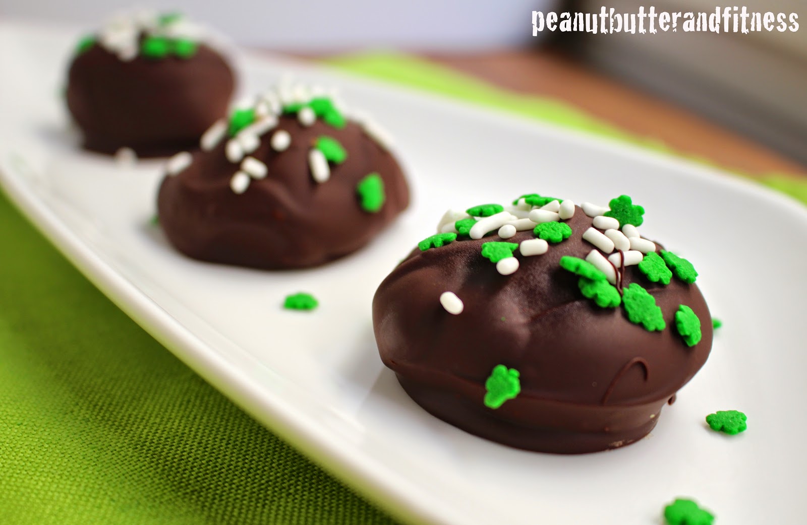I added a little bit of food coloring because green food, for whatever reason, is just so much fun to work with! Plus it’s St. Patrick’s Day. Also, I apologize for not taking any pictures of the process of making the truffles. Like I said, I tried to get these whipped up in time to catch some daylight for their photo shoot and I completely forgot! Reference my Brownie Batter Black Bean Truffles or Peanut Butter Protein Truffles for pictures, tips, and how-to’s of the process.