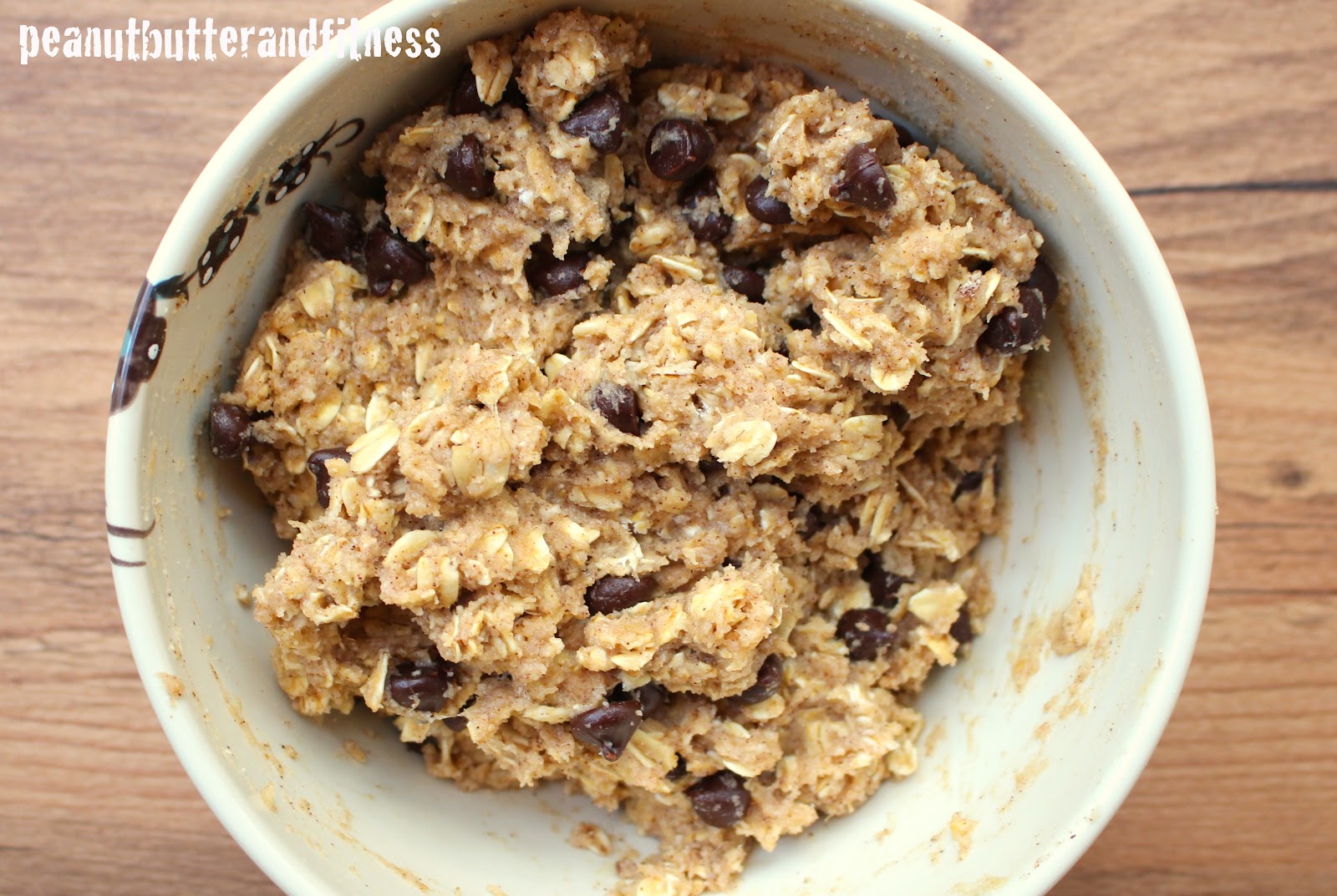 I promise these are really delicious and make a great post-workout snack or treat. Now, a little about why this is my second batch of these cookies…I originally just plopped them on the baking sheet in a round, scooped shape and expected them to spread out and get flat while they were baking. That didn’t happen. So the second time around I flattened them out before baking them like you see in the picture below…
