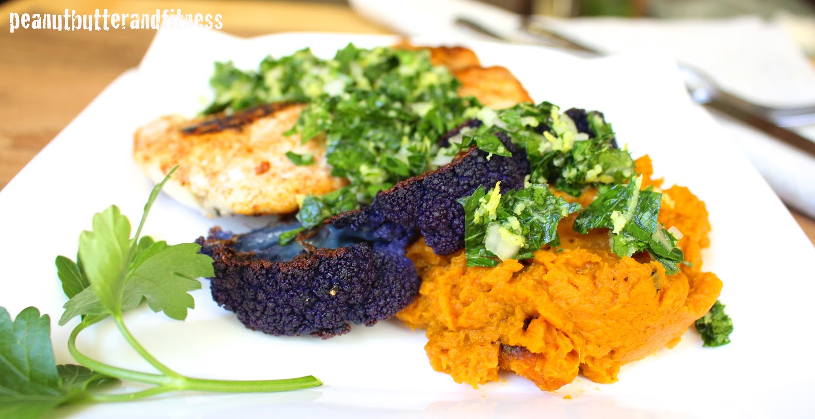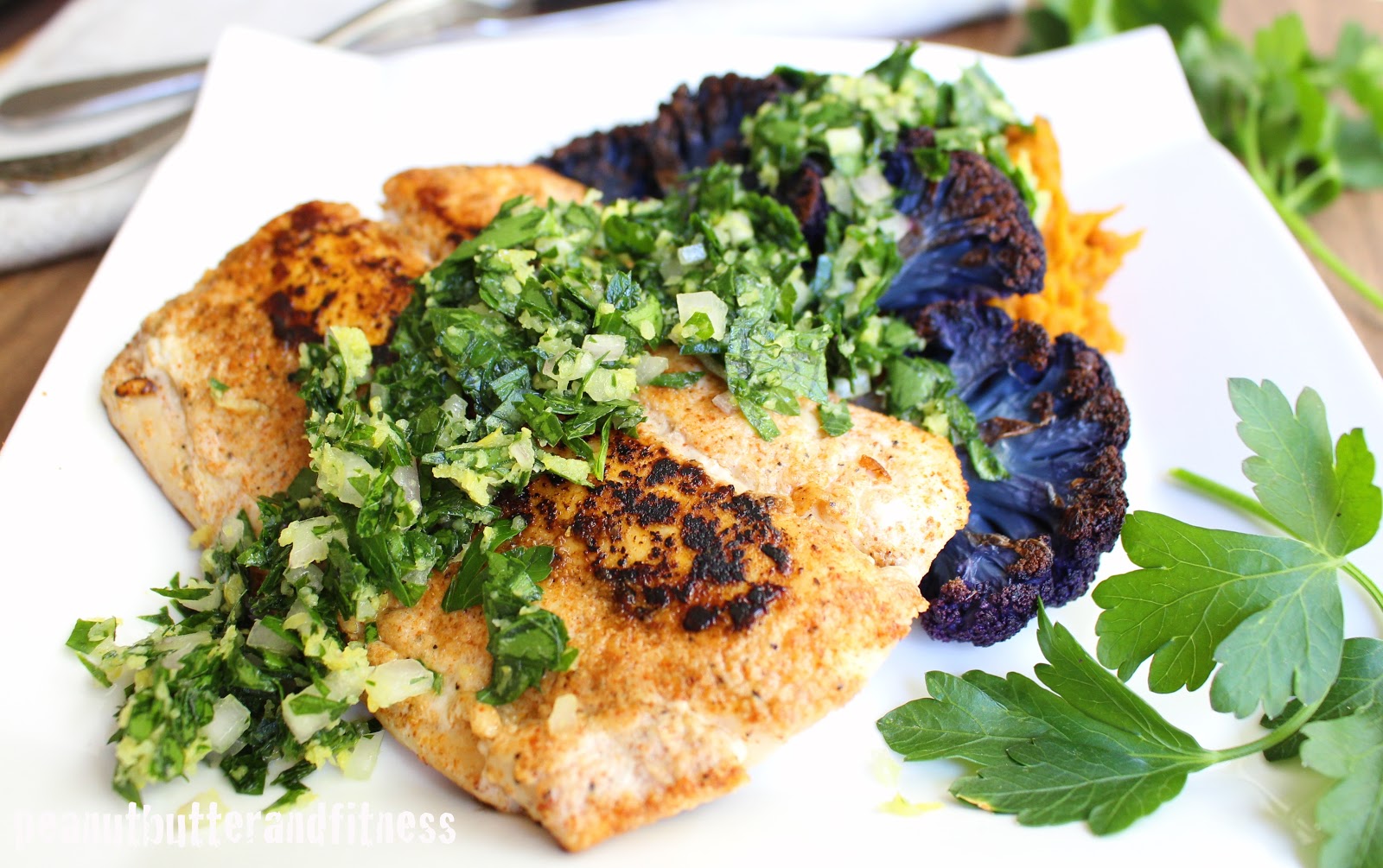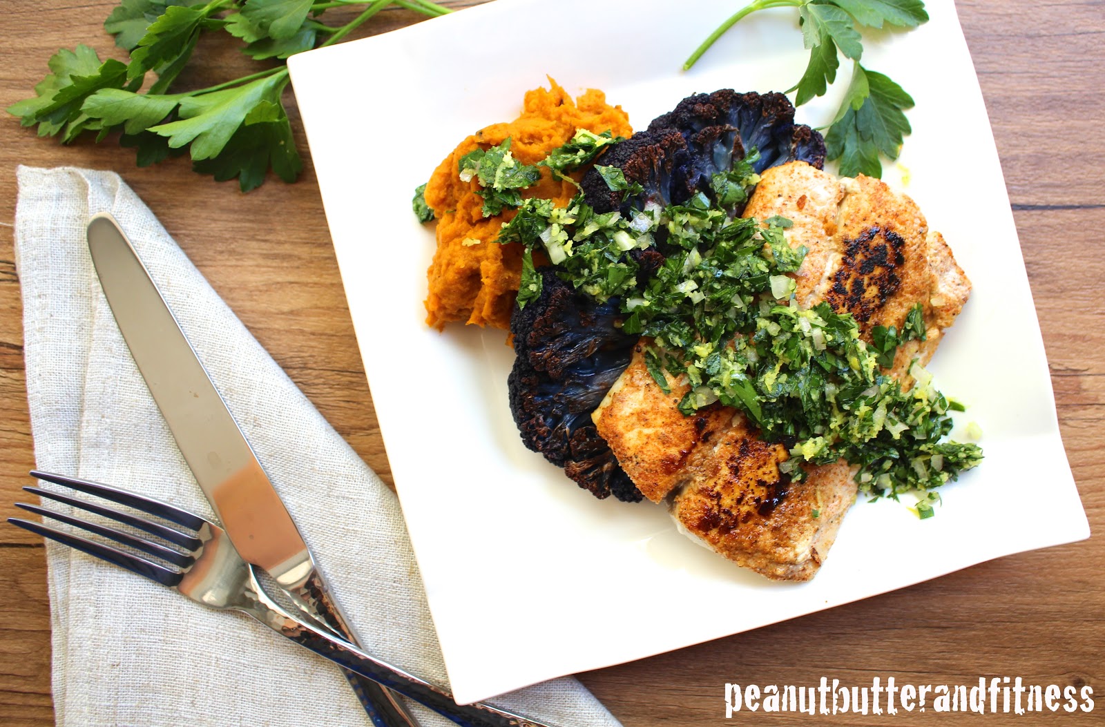 - Once carrots are roasted, remove from baking sheet and place in a bowl with 1 tbsp parsley and almond milk. Mash until they have your desired consistency. Divide carrot mash evenly among 4 plates. Layer cauliflower steaks on top of carrot mash.