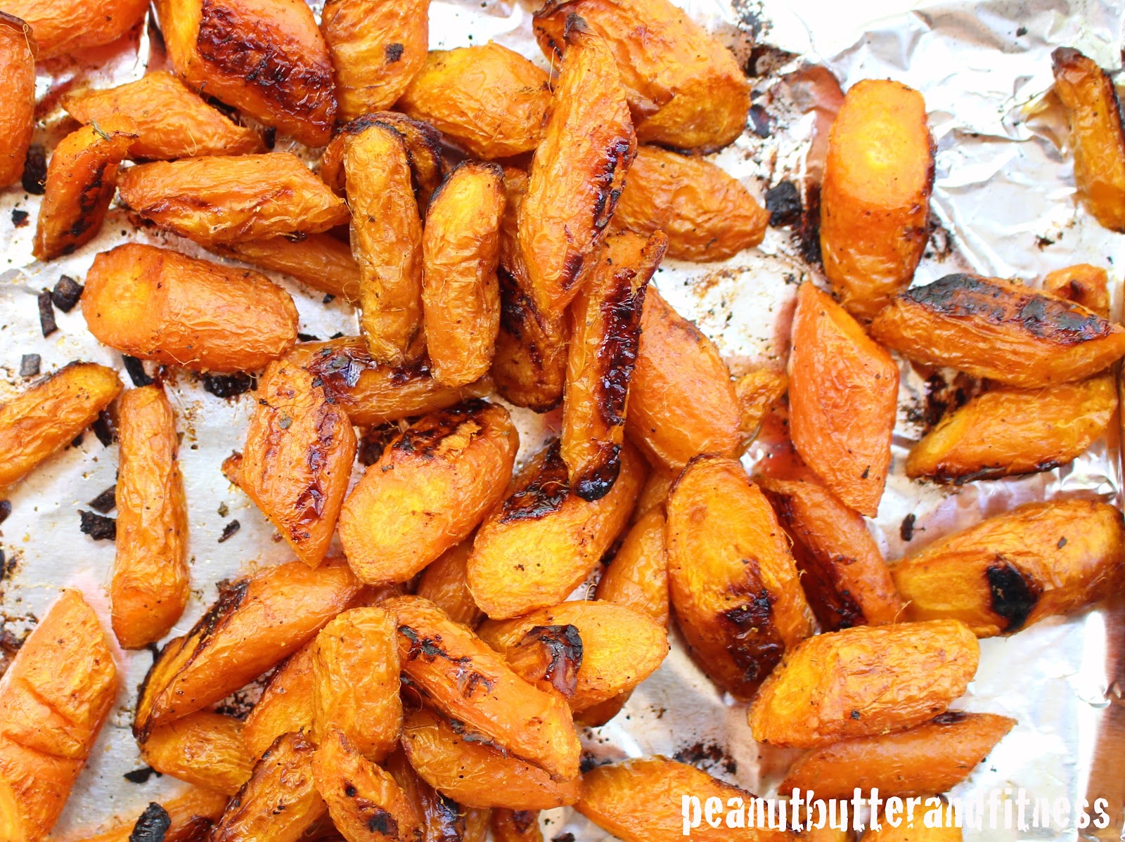 - Cut carrots diagonally into 1-2″ pieces and toss in 2 tsp olive oil. Line a baking sheet with foil or SILPAT and arrange carrots in a single layer. Bake at 425 degrees for 30-35 minutes or until tender, ensuring edges do not burn.