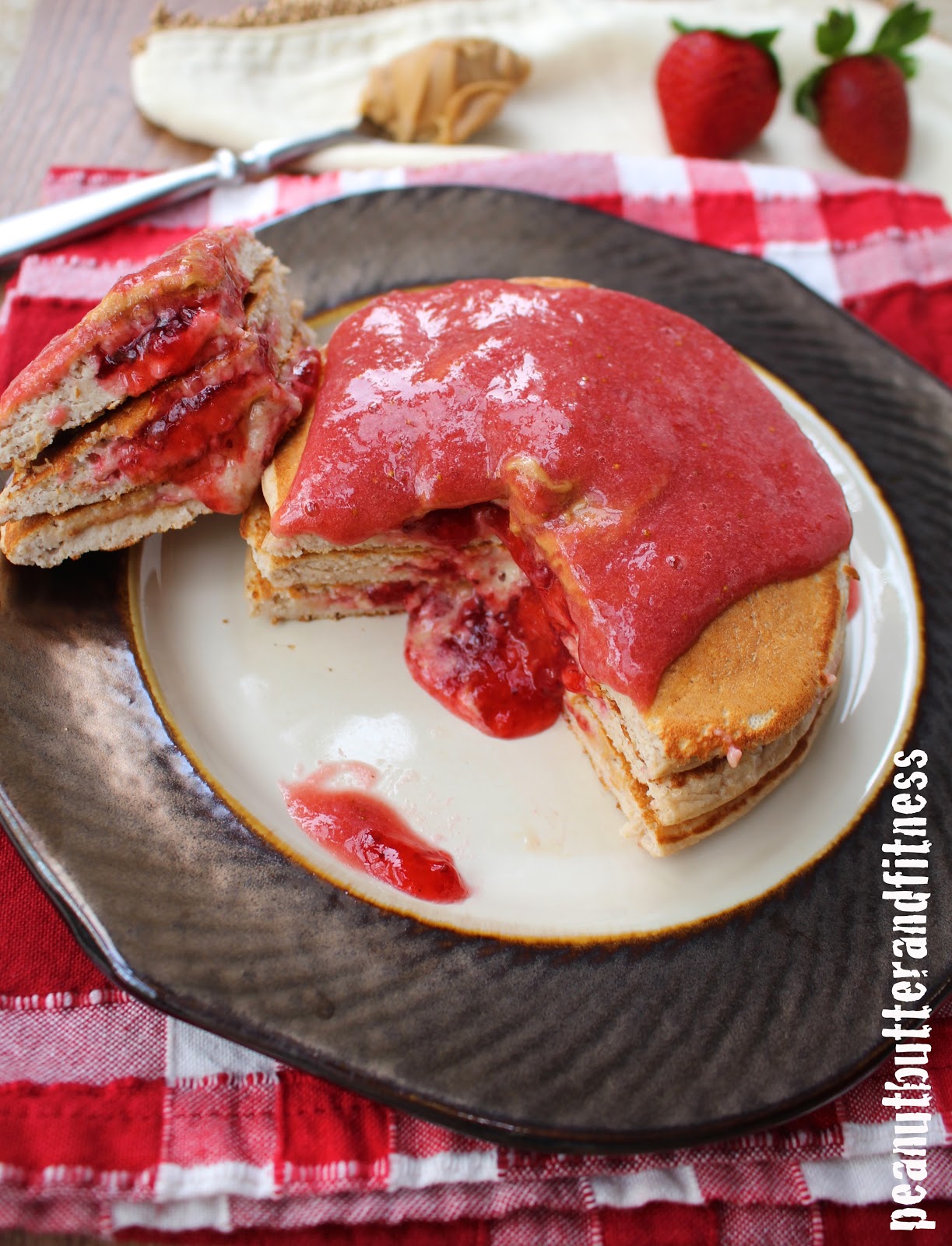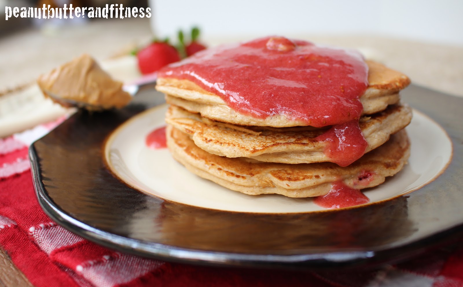 - Drizzle the non-chia strawberry sauce over top of the pancakes before serving and add a dollop of peanut butter if desired.