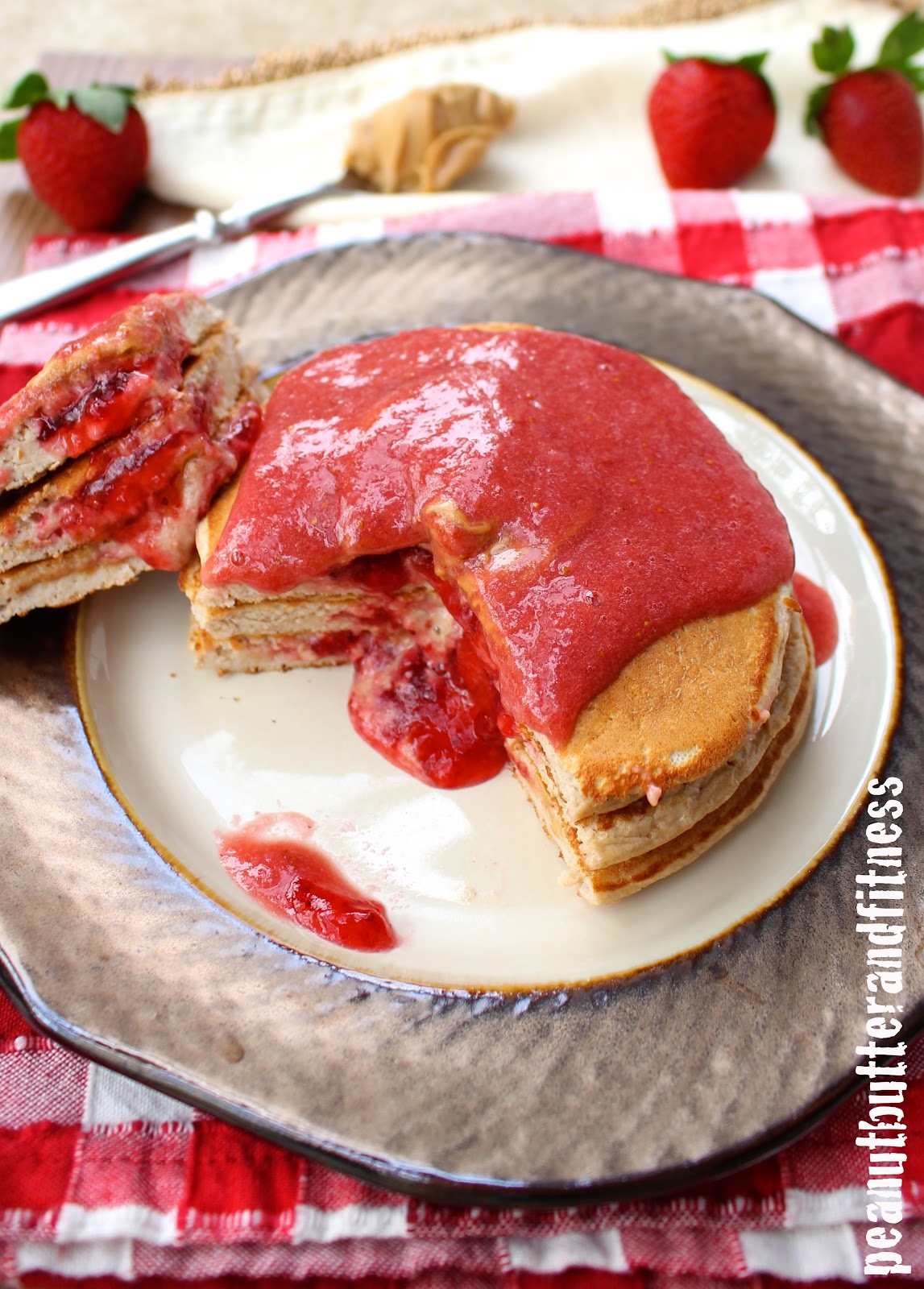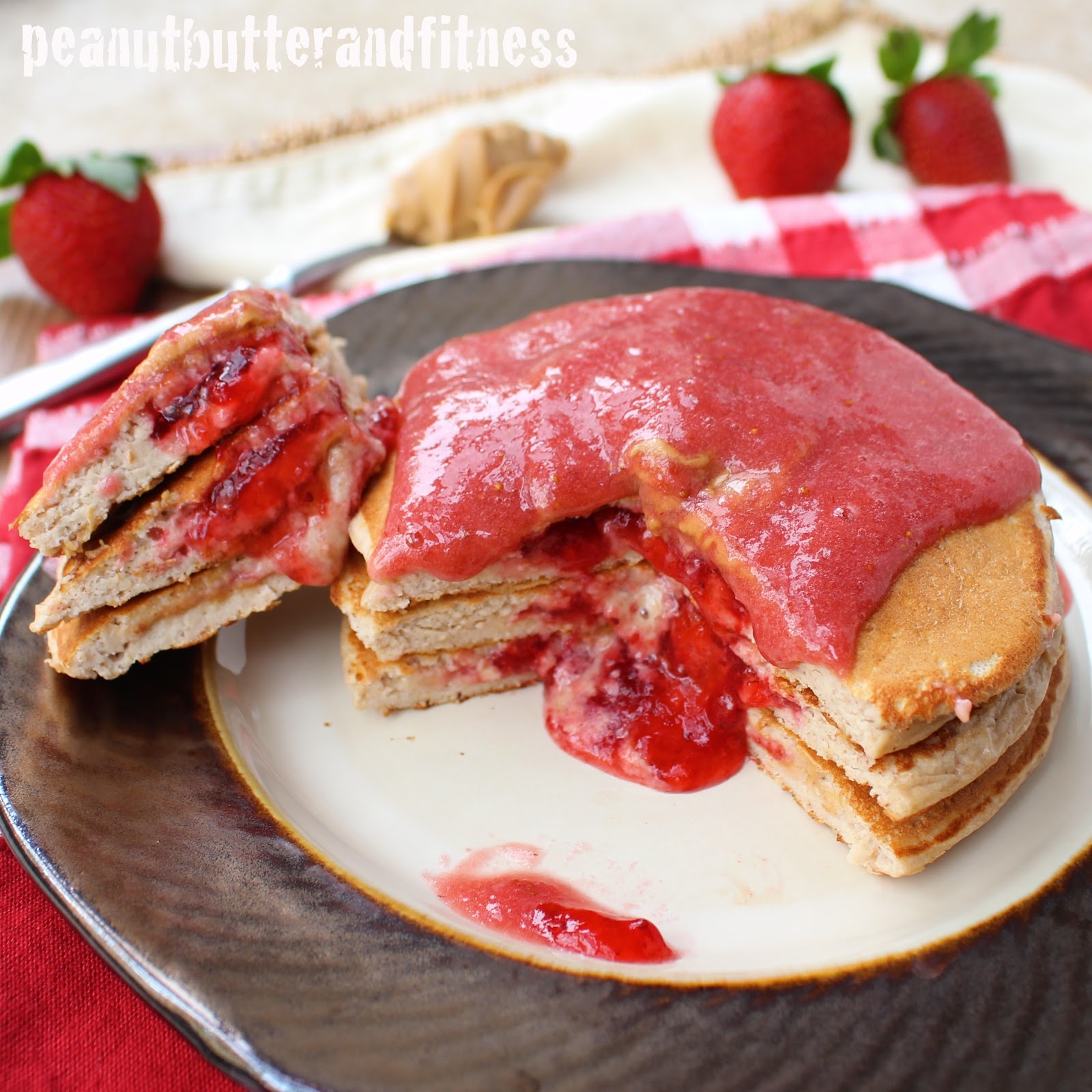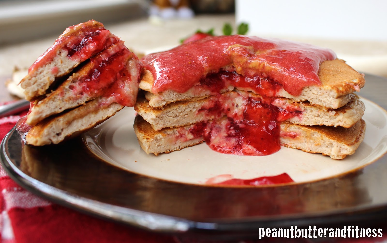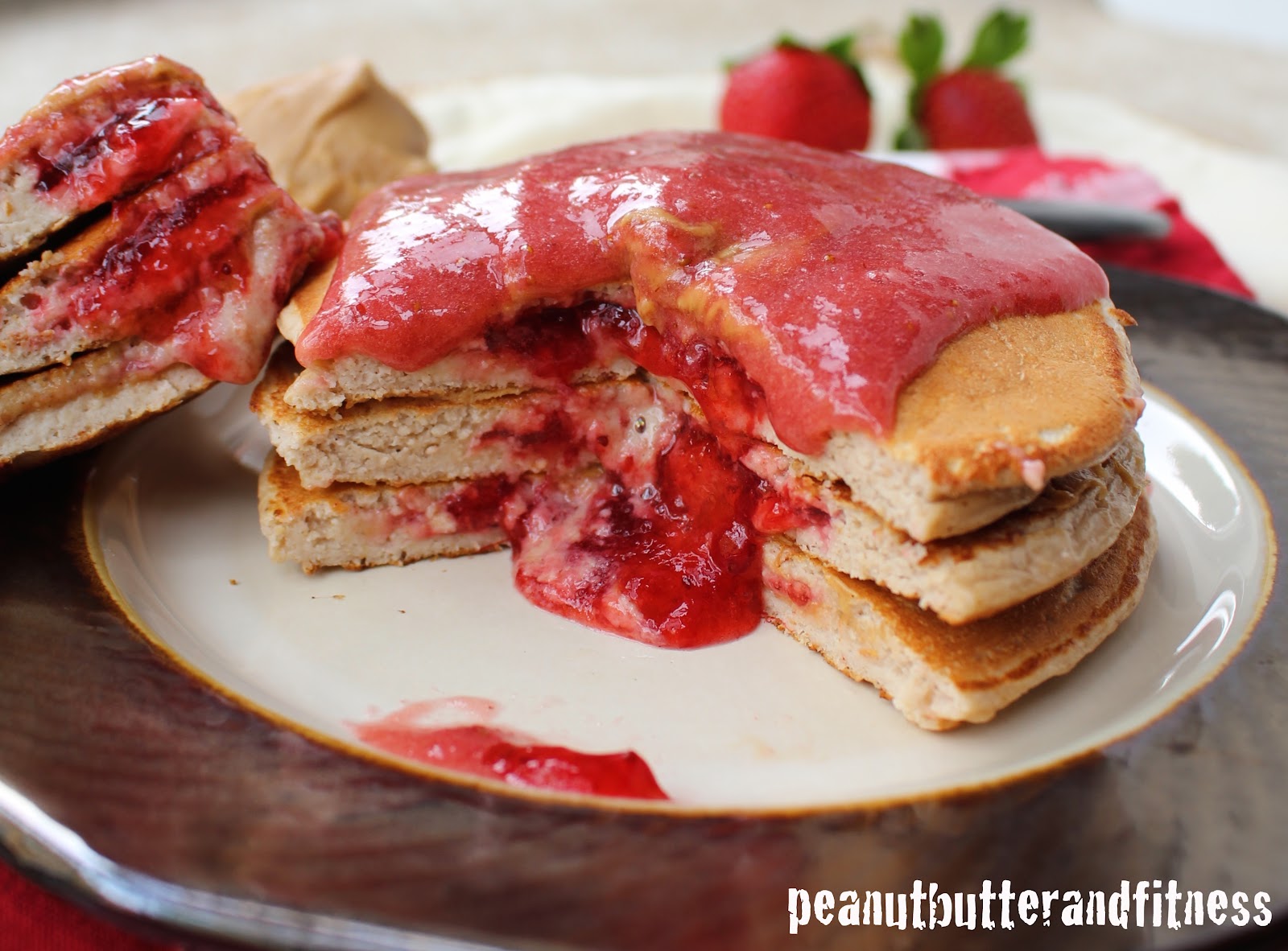 - Drizzle the non-chia strawberry sauce over top of the pancakes before serving and add a dollop of peanut butter if desired.
