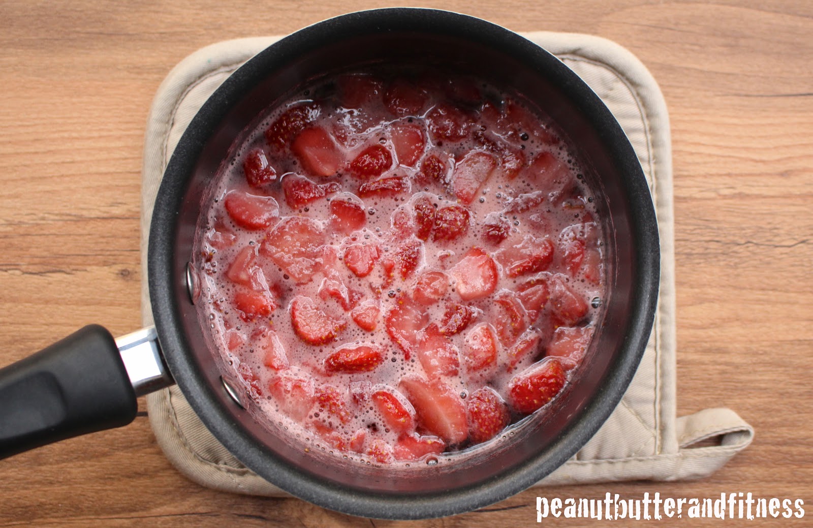 - In a small saucepan, bring strawberries, honey, and water to a boil, then simmer on low heat for 5 minutes. Place in a food processor and blend until smooth. Divide strawberry sauce in half. Add chia seeds to one half of the sauce, mix and set aside in refrigerator (preferably overnight).