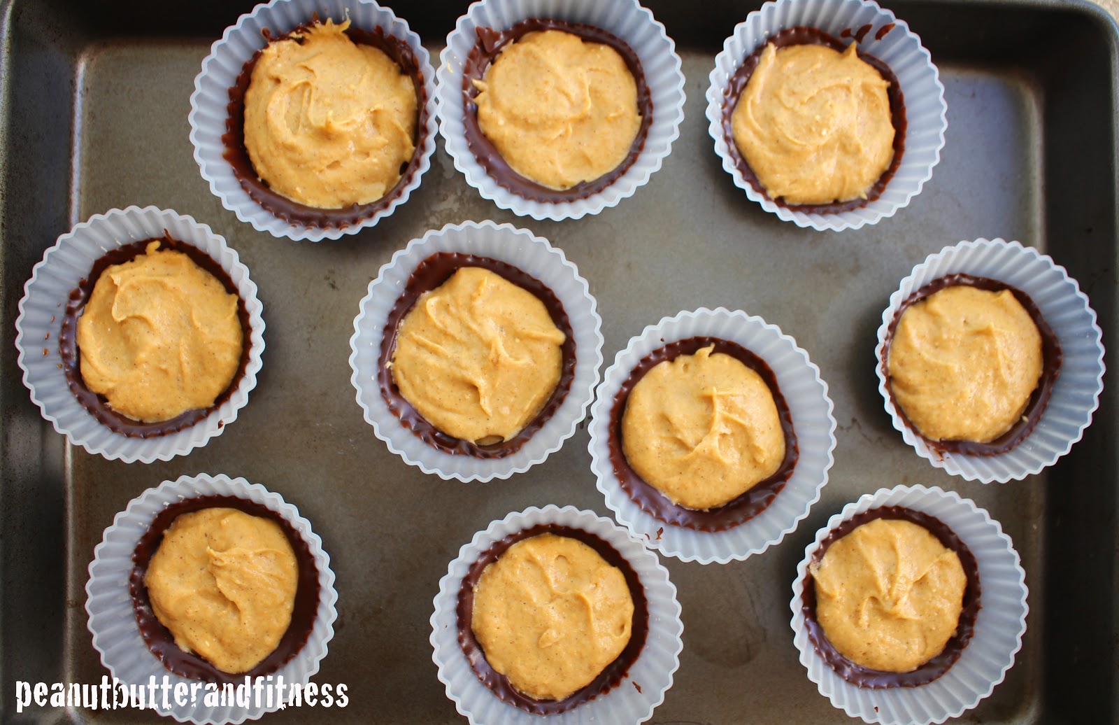 - Mix remaining ingredients until smooth. Spoon into silicone baking cups until pumpkin mix nearly reaches the top of the chocolate. Set aside in freezer for 30 mins.