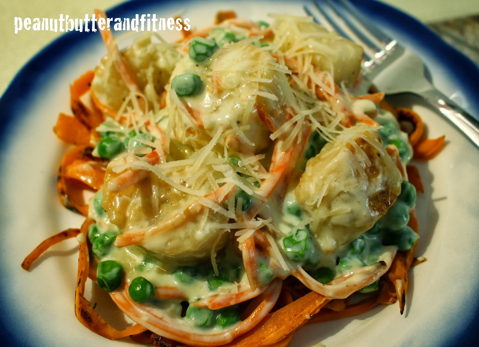 - Mix in alfredo sauce and serve over sweet potato noodles.