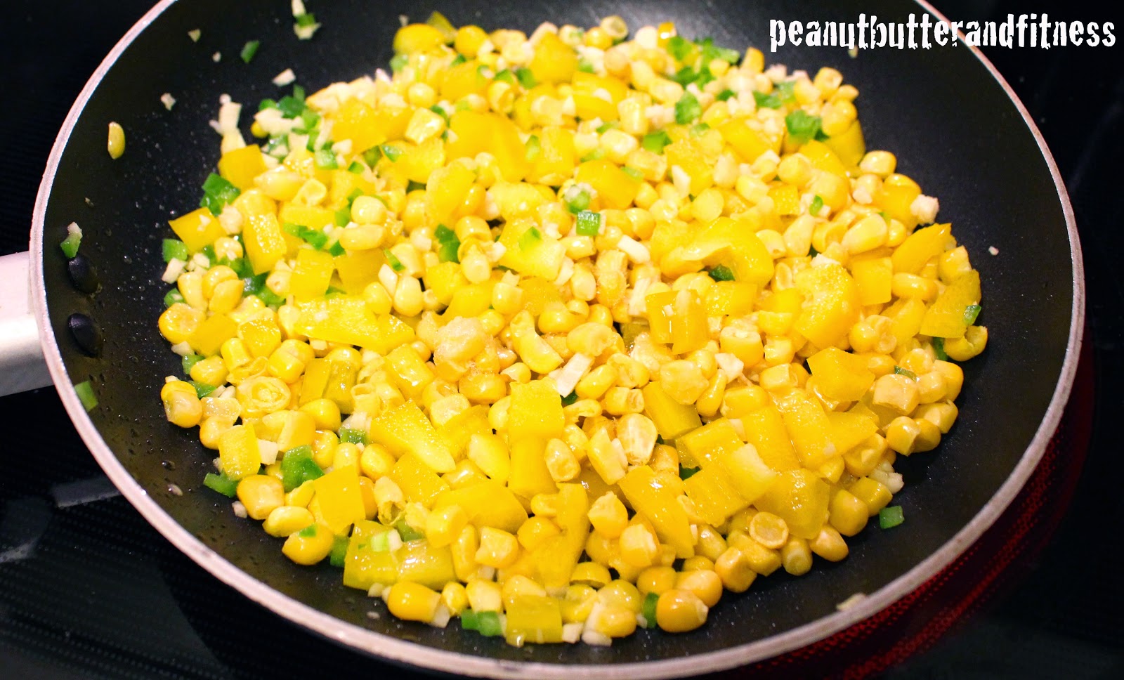 - Heat olive oil in a pan over medium high heat, then add corn, jalapeño, bell pepper and garlic. Sauce until tender.