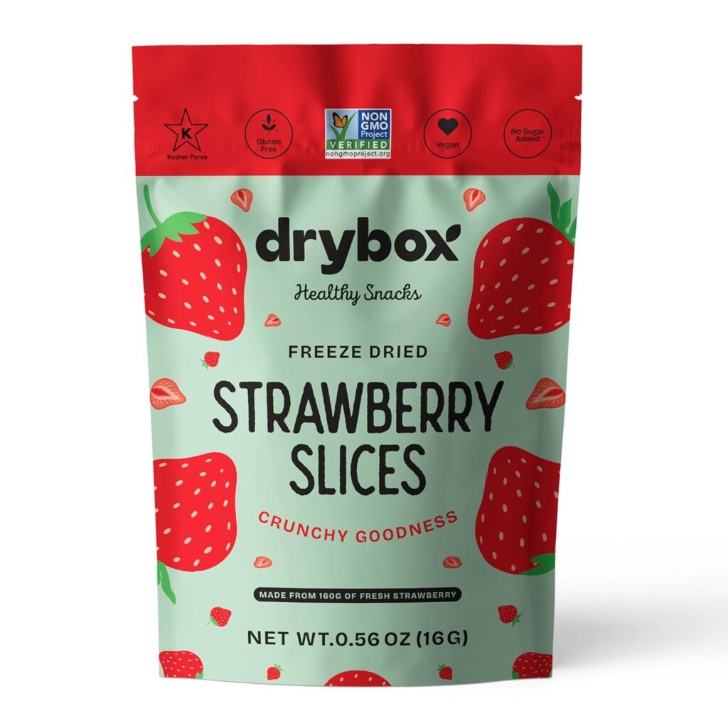 - Freeze dried strawberries – These get blended up into a powder, so sliced or whole doesn’t really matter. Freeze dried raspberries would be tasty as a substitute, but then you also have to contend with their bigger seeds.