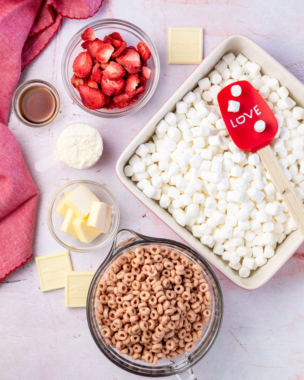 - Cereal – Use your favorite strawberry cereal. When I was testing out protein cereals, I really liked Cheerios Strawberry Protein Cereal and knew I wanted to use it in a recipe! (Not sponsored, btw.)