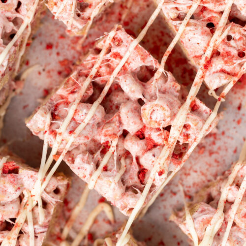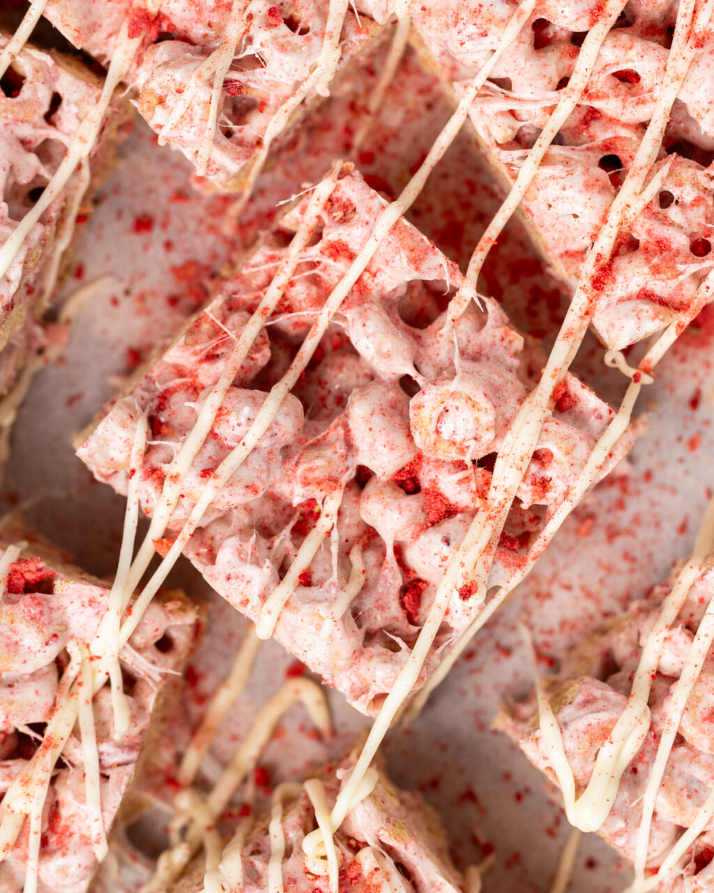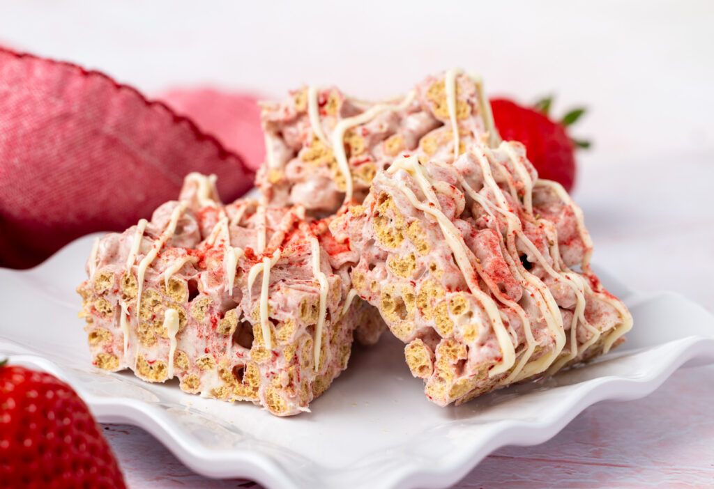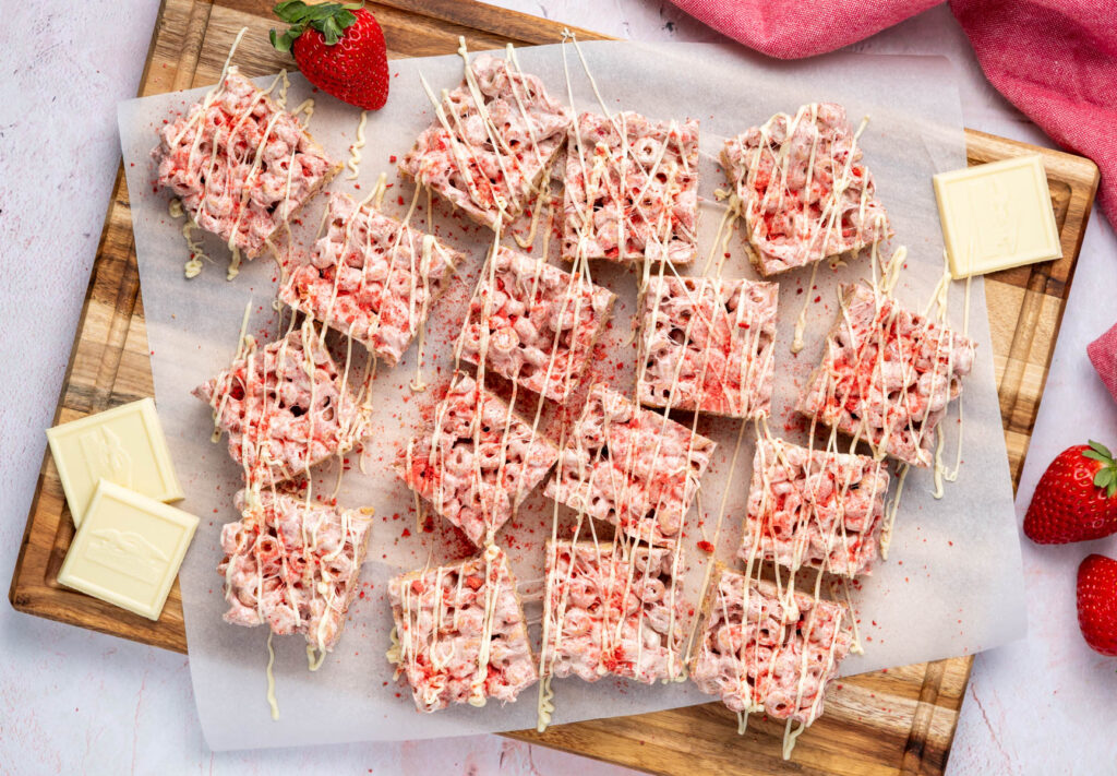 - Once the cereal treats have cooled, lift out of the baking pan and cut into 16 squares. If desired, drizzle with melted white chocolate and sprinkle with more freeze dried strawberry powder or sprinkles.