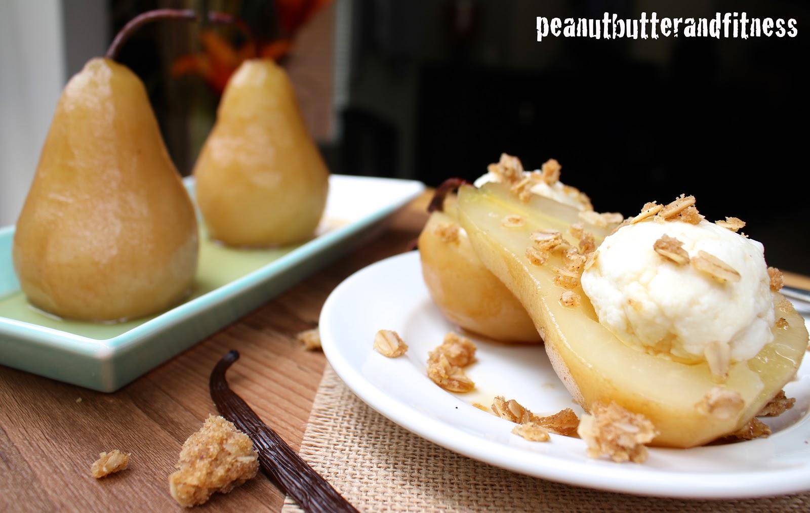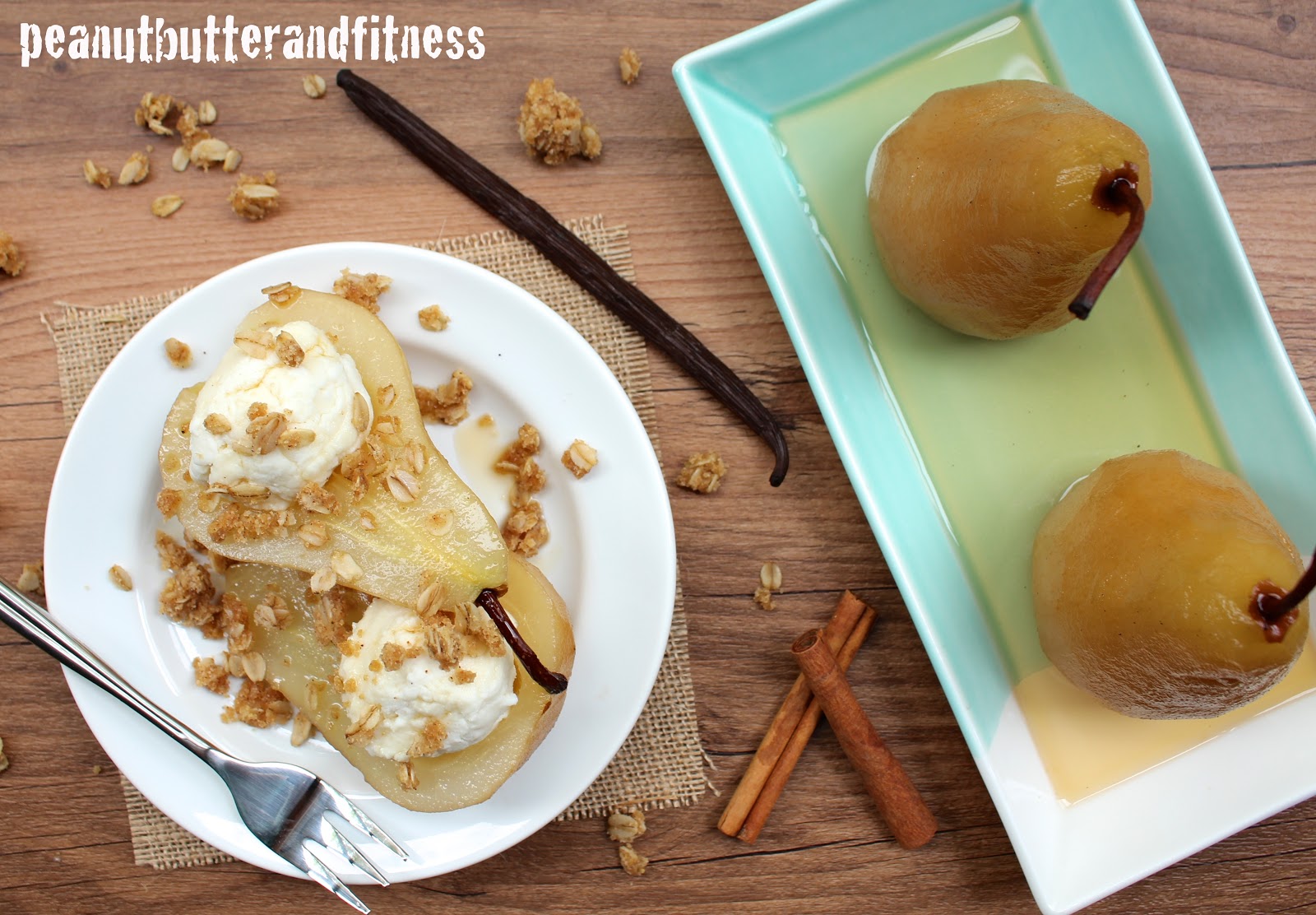 - Bring water, 1 cup maple syrup, cinnamon sticks and vanilla bean to a boil over medium high heat in a deep sauce pan. After liquid has begun boiling, lower heat and continue to simmer for 5 minutes before adding the pears.