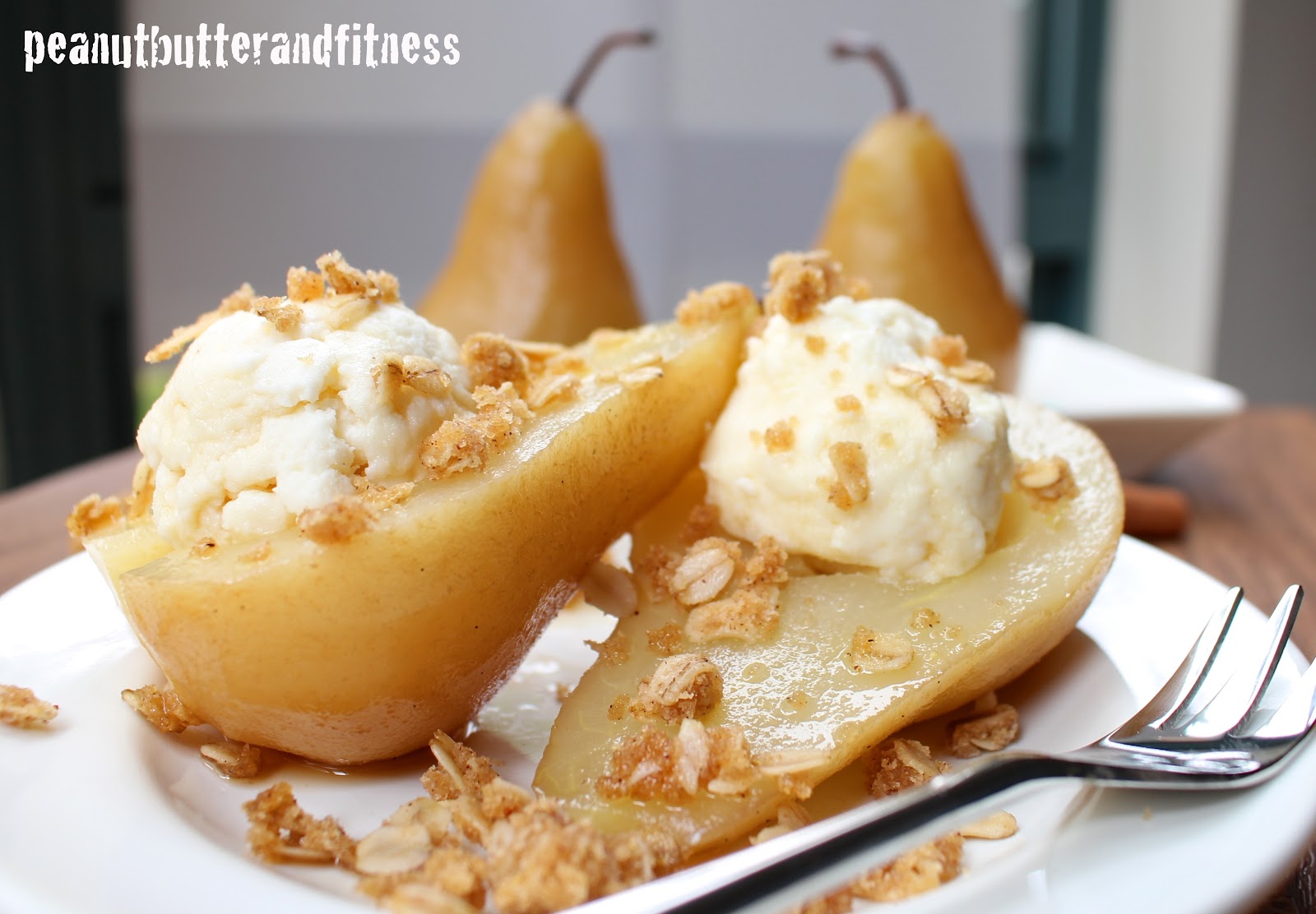 - To serve, cut pears in half, remove the core and scoop FroYo onto each pear half and top with 1 tsp maple syrup each and granola.