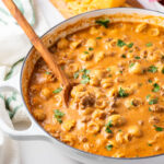 Add the blended veggie and cottage cheese sauce, milk, and broth to the cooked ground beef. Stir until combined, then add pasta and stir until the noodles are covered with liquid.