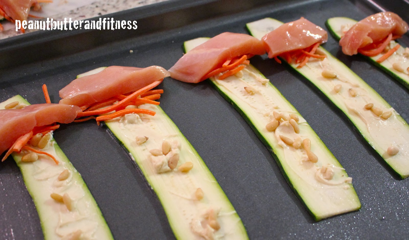 - Sprinkle pine nuts onto zucchini slices. On one end of the zucchini slices, add several pieces of carrot.